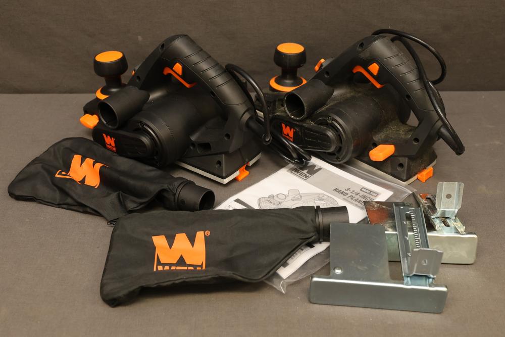 WEN Model 6530 3-1/4 Inch Electric Hand Planer with Accessories. The listing includes two hand planers, dust bags, mounting brackets, and an instruction manual. Each planer operates at 120V, 60Hz, and 6A with a motor speed of 17,000 RPM. Pickup only.