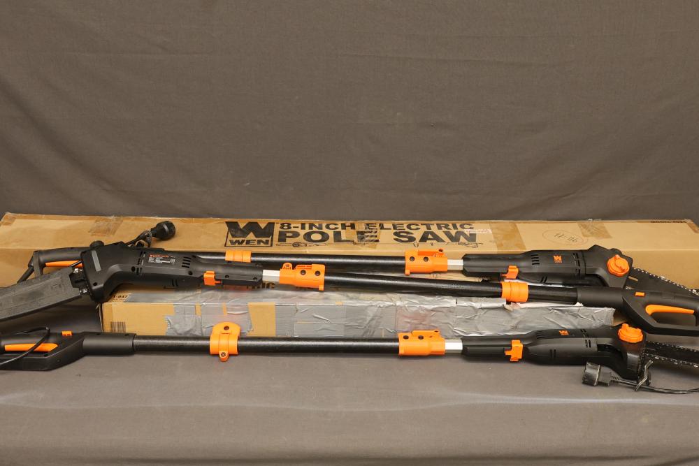 WEN Model 4019 8-Inch Electric Pole Saw, 6-Amp. Features include a motor speed of 3800 RPM and a chain speed of 36 ft/sec. Includes multiple pole sections for extended reach and user manual. Items that are not in boxes are operational. Boxed units are intended for parts. Pickup only.