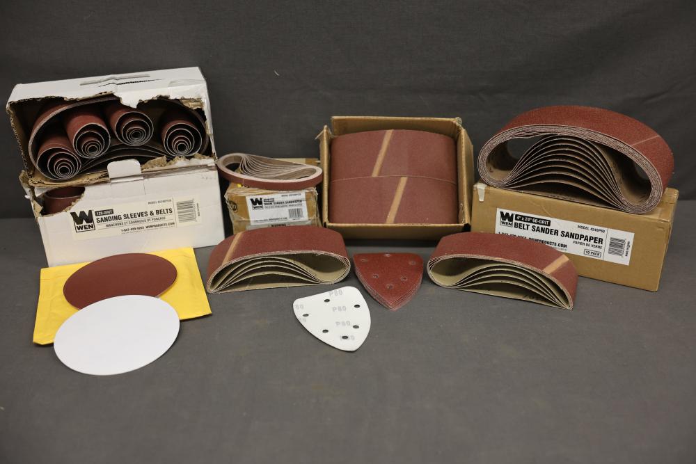 WEN Sanding Sleeves, Discs, and Belts with Models 65910SP120, 6SD120, and 4294SP. Includes drum sander sandpaper, sanding sleeves and belts, welding discs, and belt sander sandpaper. Pickup only.
