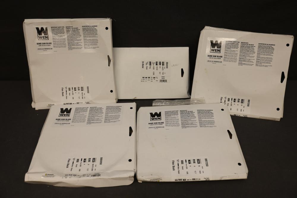 WEN Bandsaw Blades BB9950, BB4550, and BB7250 Flex Back and Bi-Metal. Includes specifications: BB9950 (Long: 100.75 in, Wide: 0.5 in, TPI: 4, Thickness: 0.025 in), BB4550 (Long: 44.875 in, Wide: 0.5 in, TPI: 10/14, Thickness: 0.020 in), and BB7250 (Long: 72 in, Wide: 0.5 in, TPI: 6, Thickness: 0.025 in). Pickup only.
