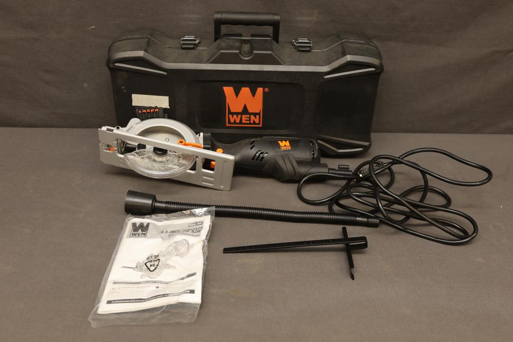 WEN Model 3625 4-Inch Circular Saw With Accessories. Includes a 4-inch circular saw, supporting tools, and carrying case. Features a motor with 120V, 60 Hz, and 3500 RPM speed, a 4.25-inch diameter blade, and an arbor size of 3/8 inches. Pickup only.