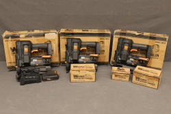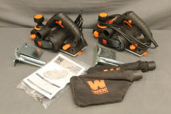 WEN 6530 3-1/4 Inch Electric Hand Planer Set with Accessories. Includes two WEN 6530 Electric Hand Planers, user manuals, dust bags, and guides. Tools are designed for power planing needs with 120V motor, 60Hz frequency, and 17,000 RPM speed. Packaged in original boxes. Pickup only.