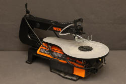 WEN Model 3921 Variable Speed 16-Inch Scroll Saw. Features a motor with 120V AC, 60Hz, 1.2A operation, variable speeds from 550 to 1600 SPM, and a 5-inch blade capacity. Includes control buttons and a metal base, but does not include saw band. Pickup only.