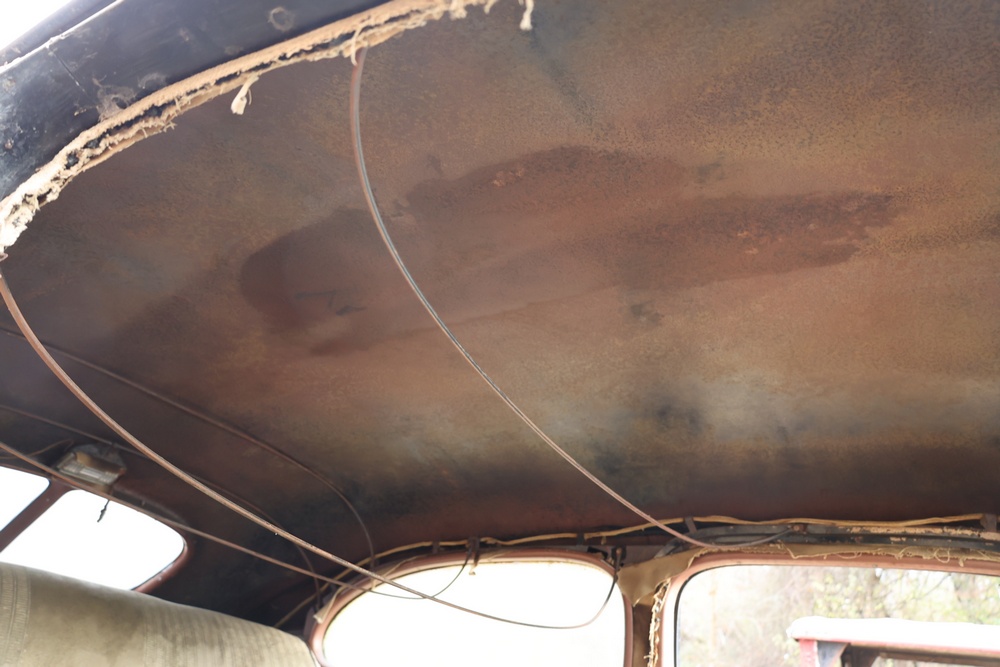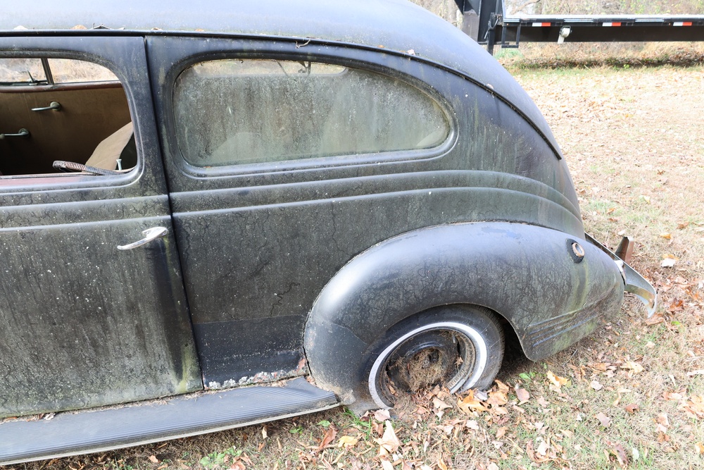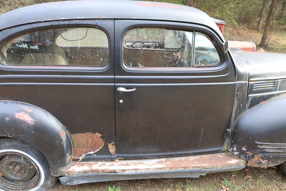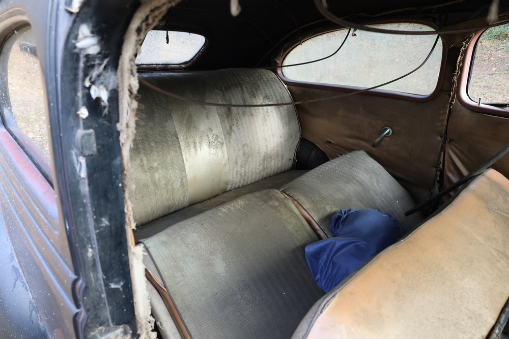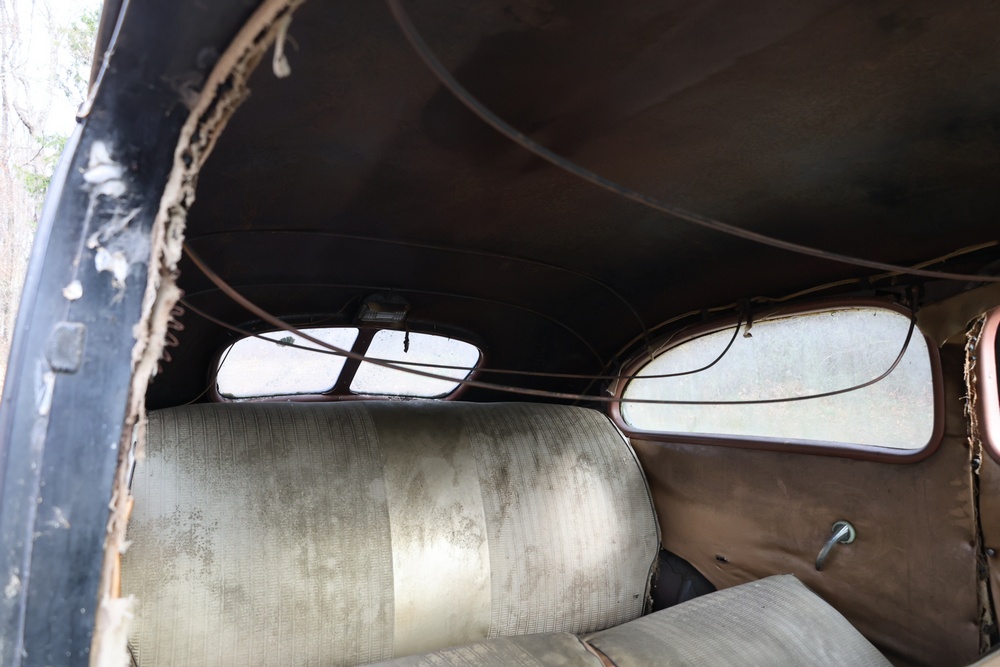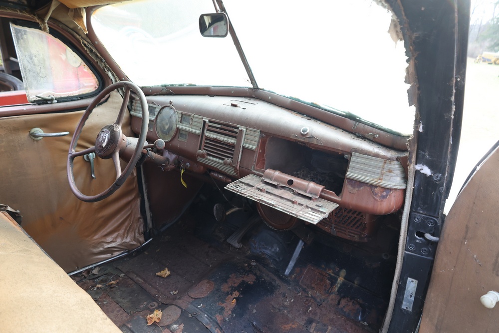 1938 Dodge two-door sedan. VIN: 46981. Odometer reading: not visible. The vehicle is not equipped with an engine or transmission. Interior features include a metal dashboard with Dodge-branded center grille, original gauge cluster, manual pedals, steering wheel, and partial interior trim. Title is available.