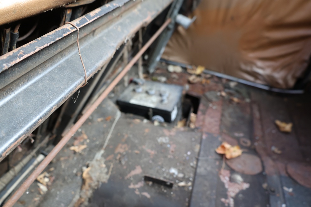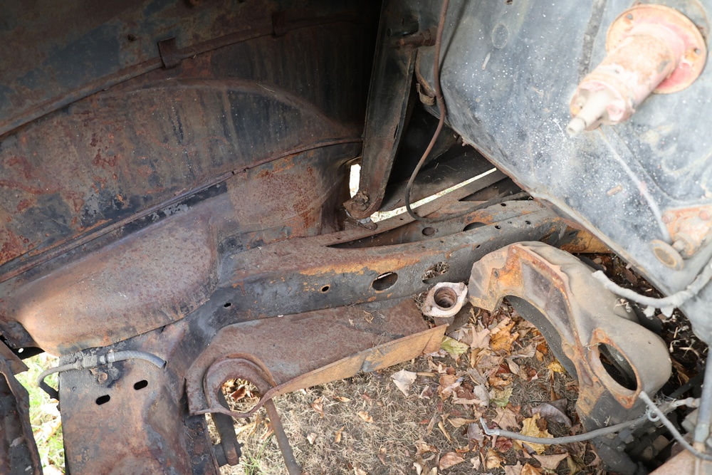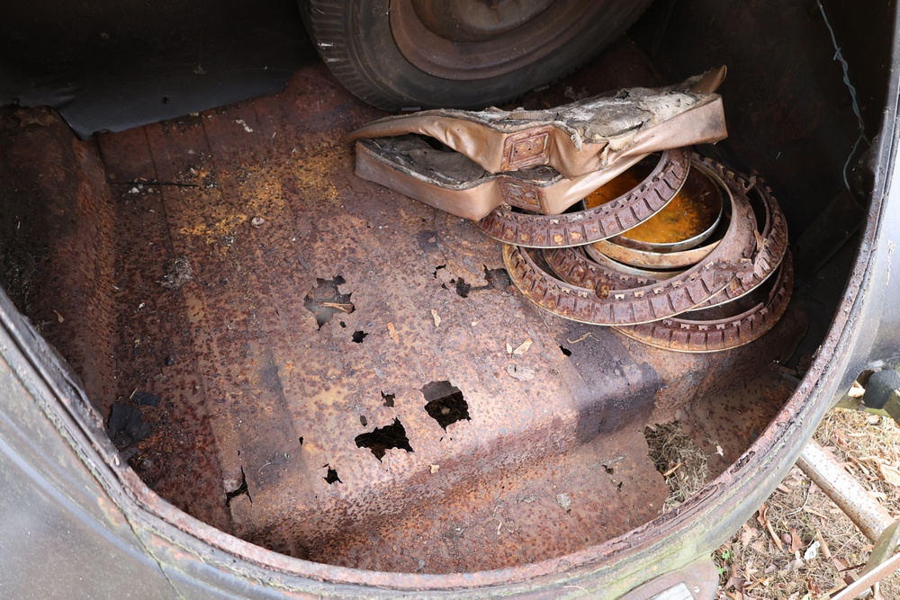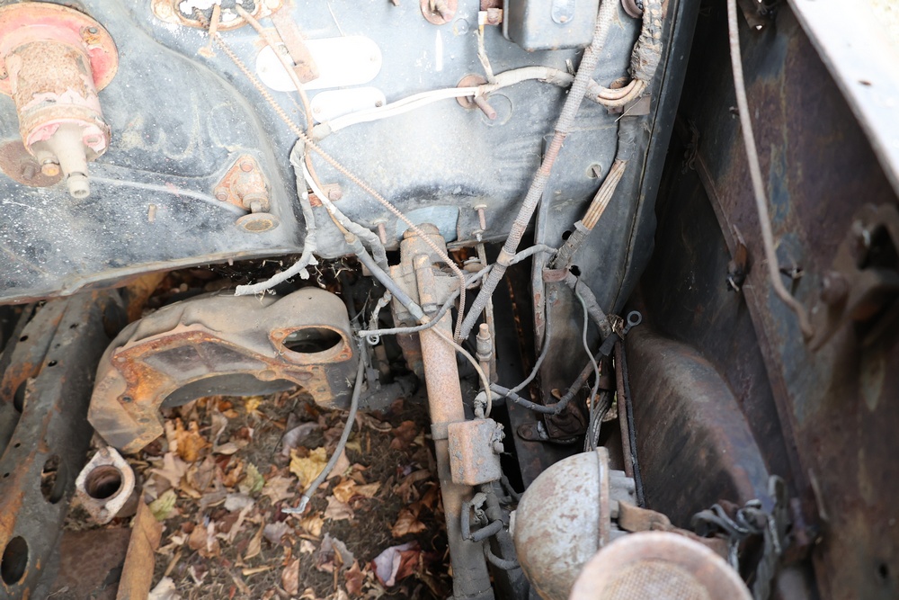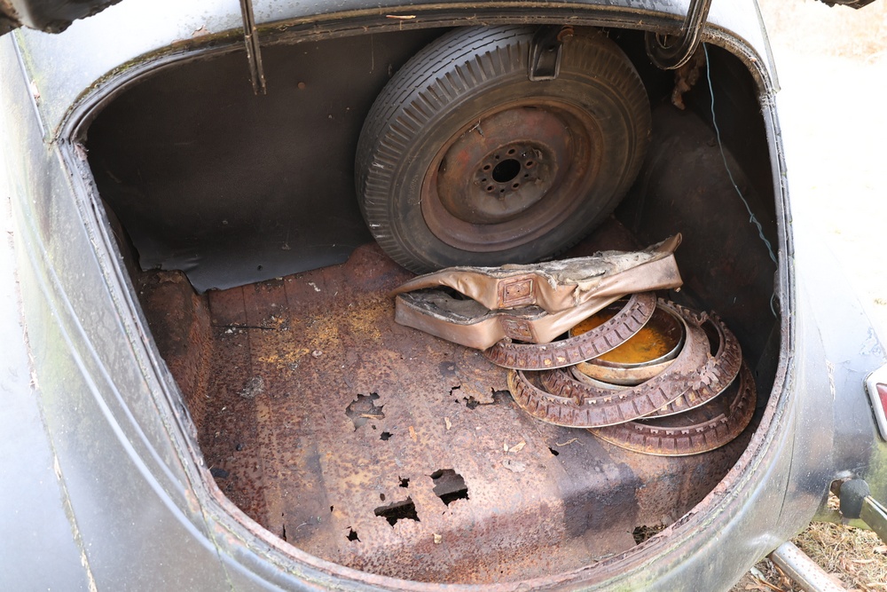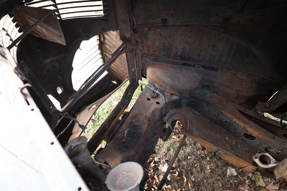 1938 Dodge two-door sedan. VIN: 46981. Odometer reading: not visible. The vehicle is not equipped with an engine or transmission. Interior features include a metal dashboard with Dodge-branded center grille, original gauge cluster, manual pedals, steering wheel, and partial interior trim. Title is available.