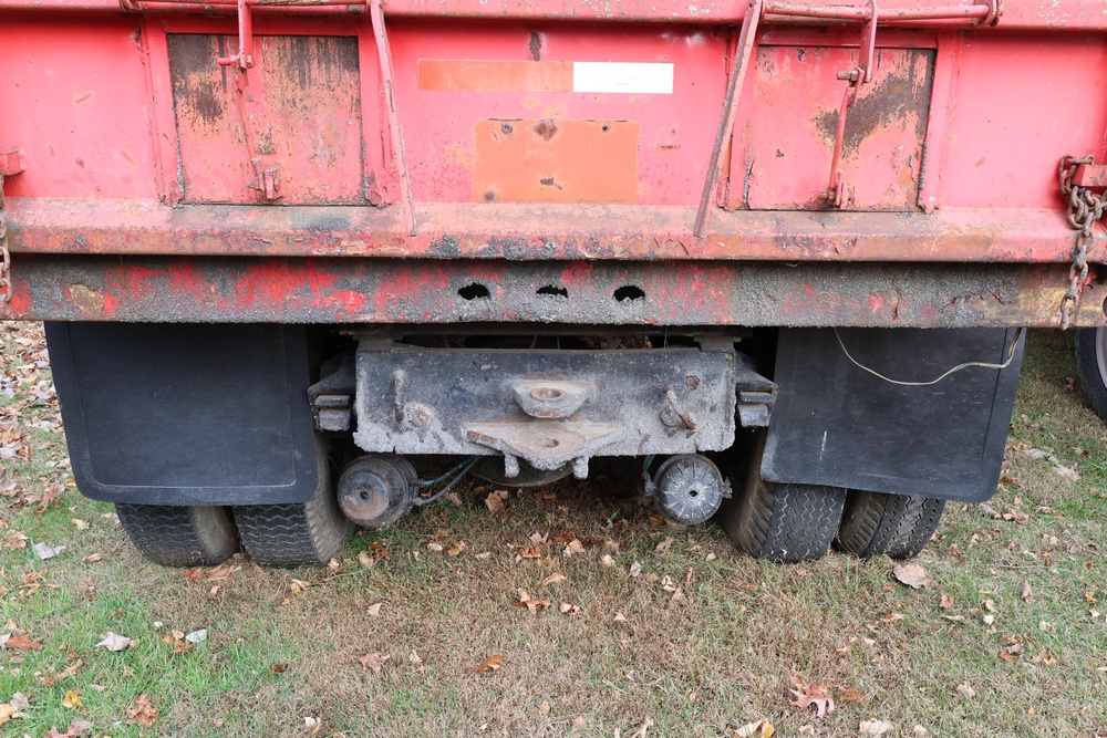 1978 Ford dump truck. VIN: R902VDE6672. Body: two-door dump truck with steel dump bed and dual rear wheels. Engine: 671 Detroit Diesel. Transmission: 10 speed road ranger manual with floor-mounted shifter. Odometer reading: 214821. Features include a front chrome grille, dual fuel tanks, left-hand mirror, multi-gauge instrument cluster, and hydraulic dump assembly. Seller reports: hasn't been used, ran when parked, motor will turn over. Bill of sale only. Battery may need to be replaced.