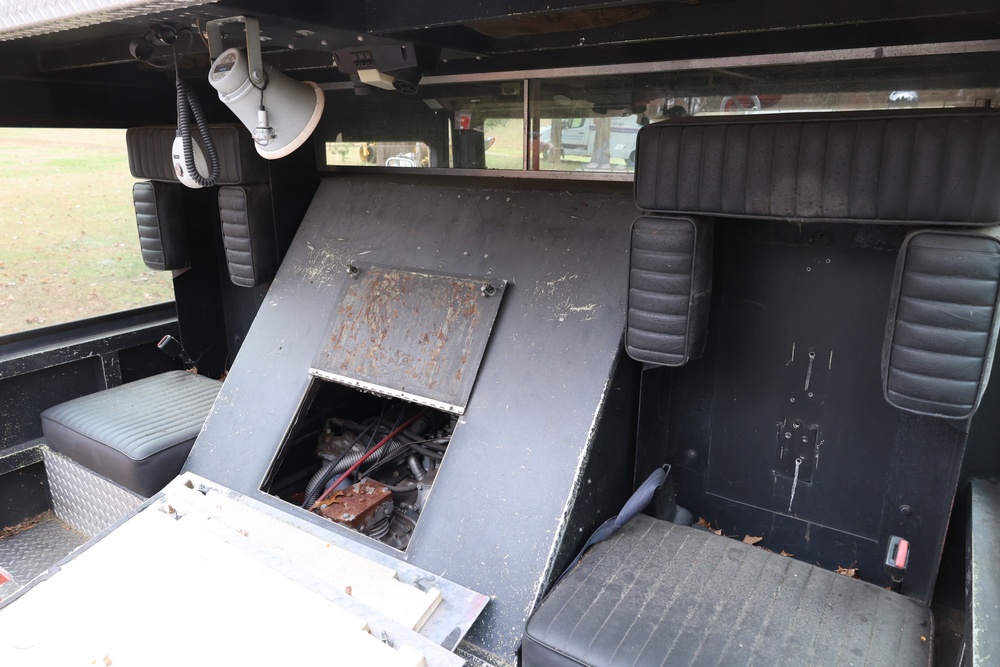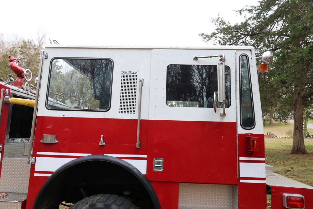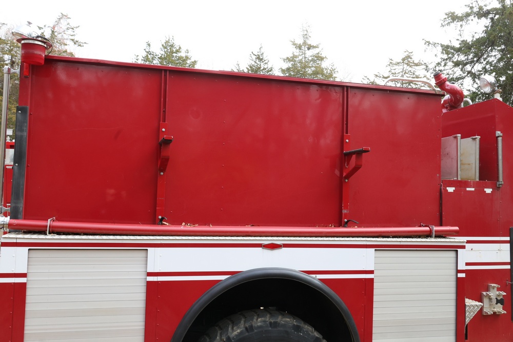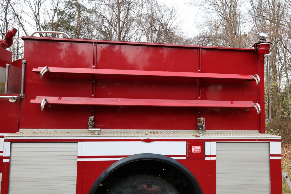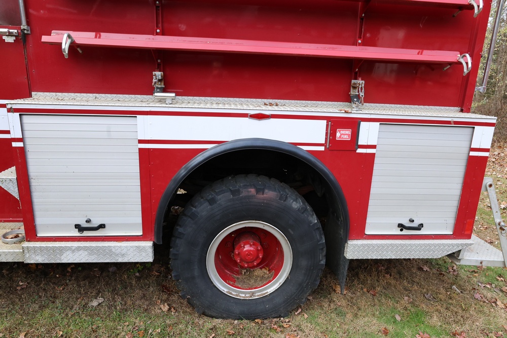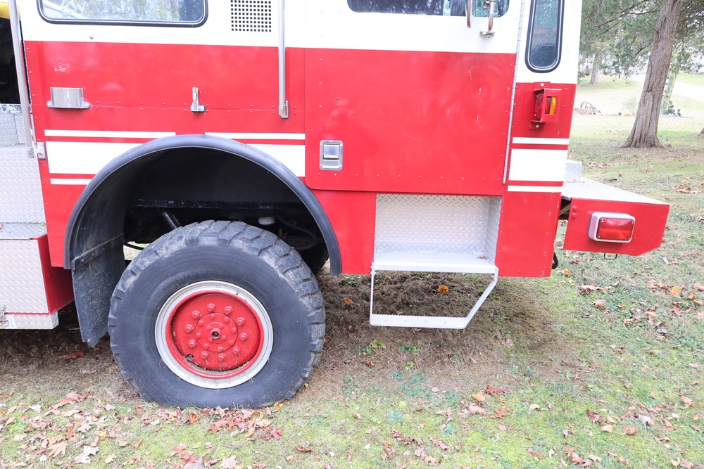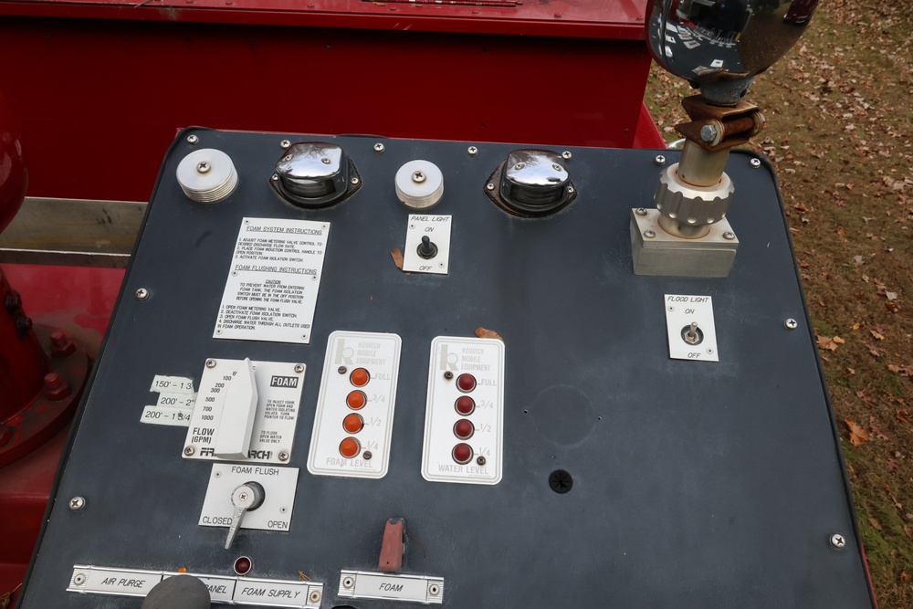 1990 Kovatch KFT-12 P-24 AWD brush-structural firefighting truck. VIN: KFT383 visible. Body: tandem-axle fire truck with enclosed cab and integrated water tank body. Engine: 6V92TA, information plate lists engine serial 6VF166054; pump motor number 06VF166054. Allison Automatic transmission. Odometer reading: 014390. Hour meter reading 515. Features include a 600-gallon water tank and 55-gallon foam capacity as labeled, W.S. Darley Champion fire pump rated at 1000 GPM (type LDM1000), exterior pump-control panel with multiple discharge levers and gauges, front bumper platform, rear step platform, roof emergency lighting, dual side mirrors, and all-terrain tires. Manufacturer data plate lists GVW 33,600 lbs, overall length 337 in., height 118 in., width 95 1/4 in., and shipping weight 23,260 lbs. Seller reports: runs and drives, title and key available. Battery may need to be replaced to start.