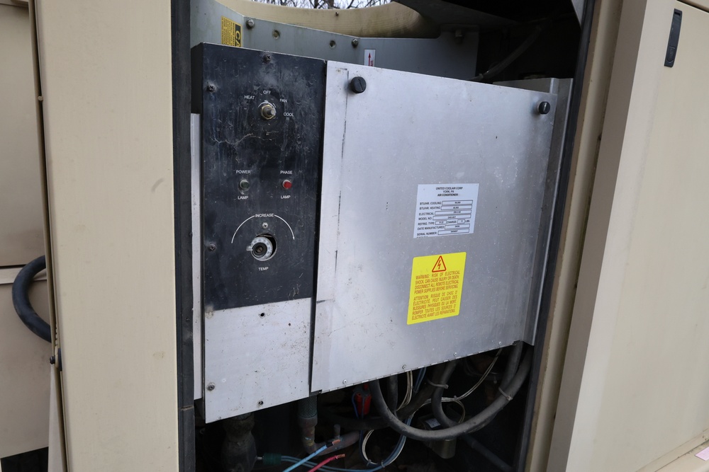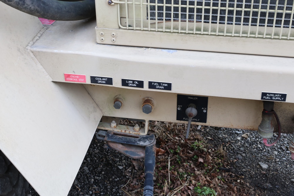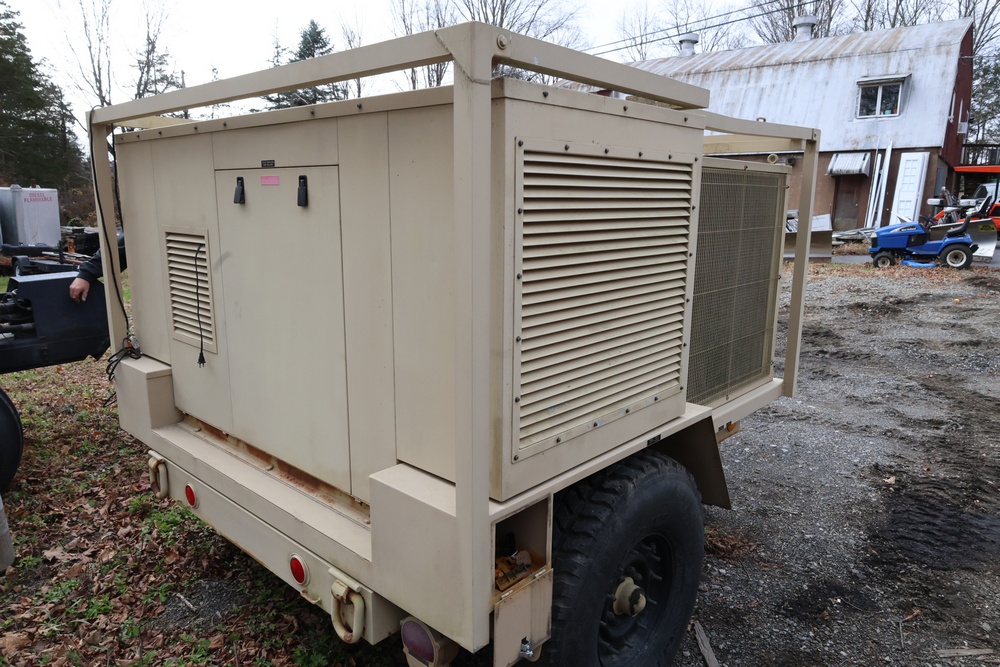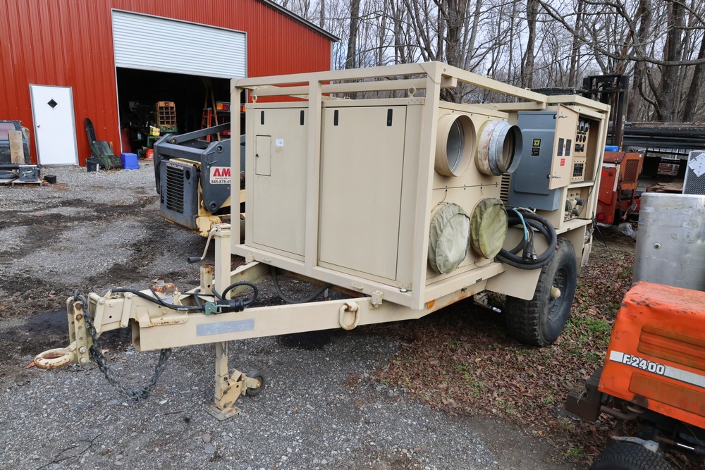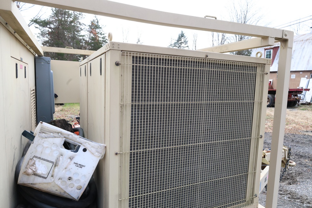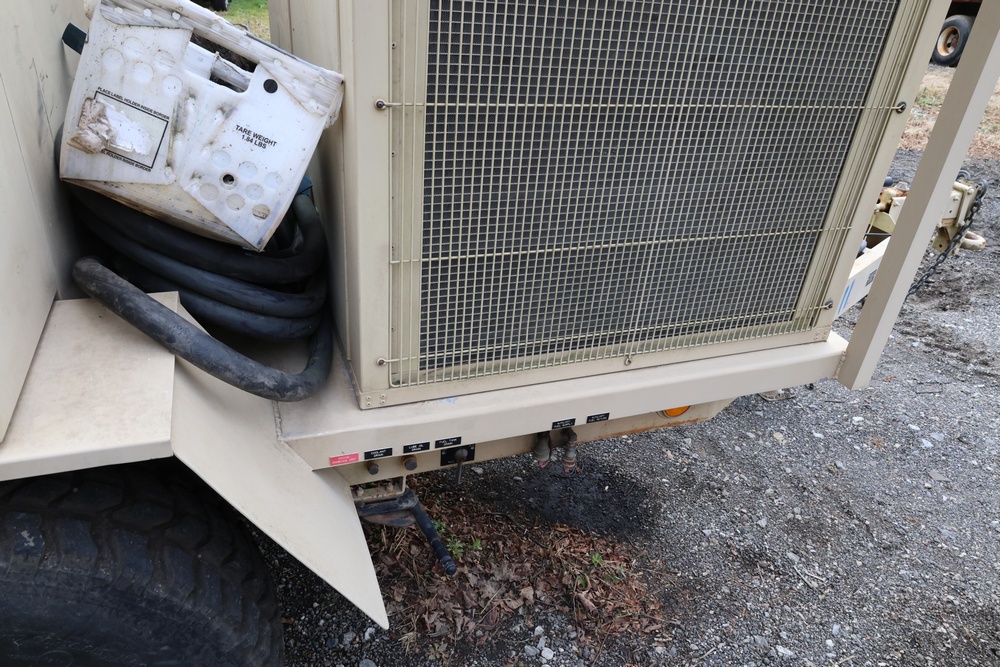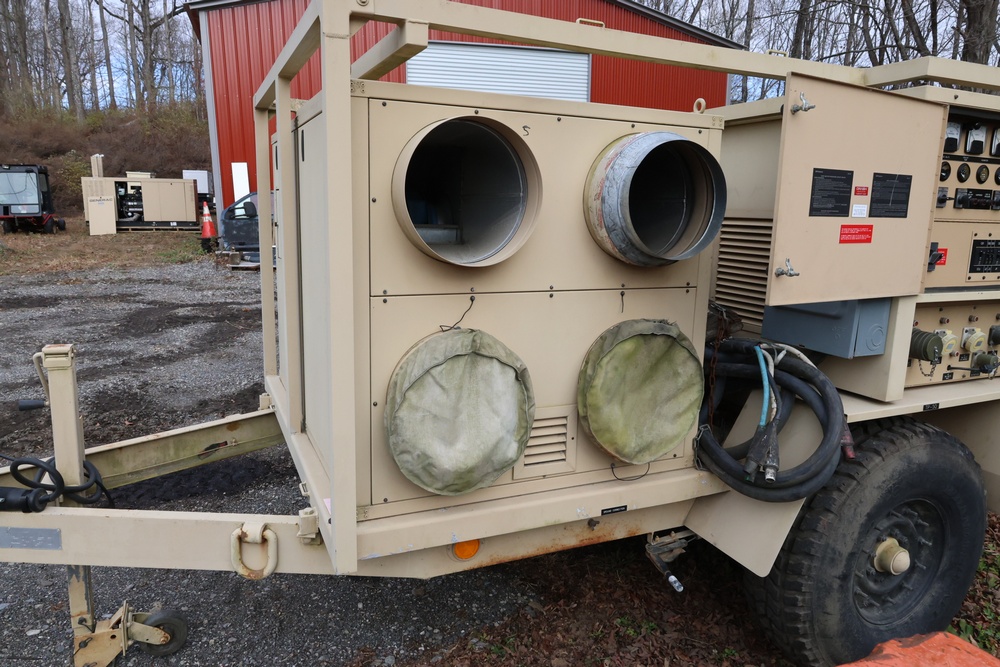 DHS Systems trailer-mounted environmental control unit with United CoolAir DHS-8HT air-conditioning system (96,000 BTU cooling / 45,900 BTU heating), and onboard 30 KW diesel generator, showing 127.4 hours. Seller reports: generator runs but motor on cooling fan does not (see photos).
