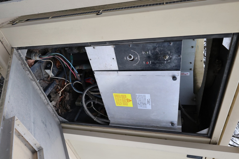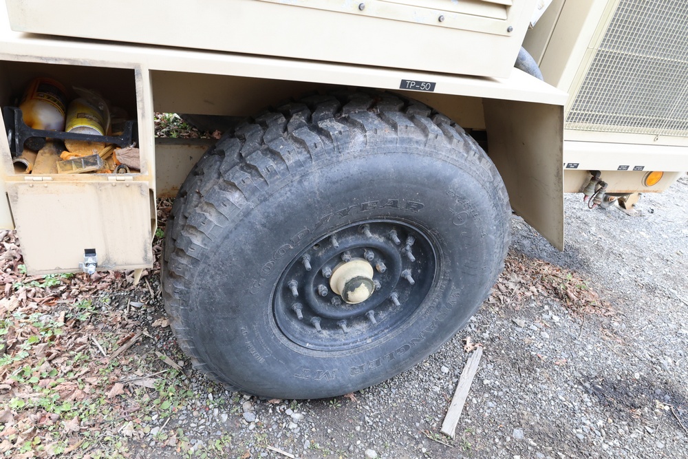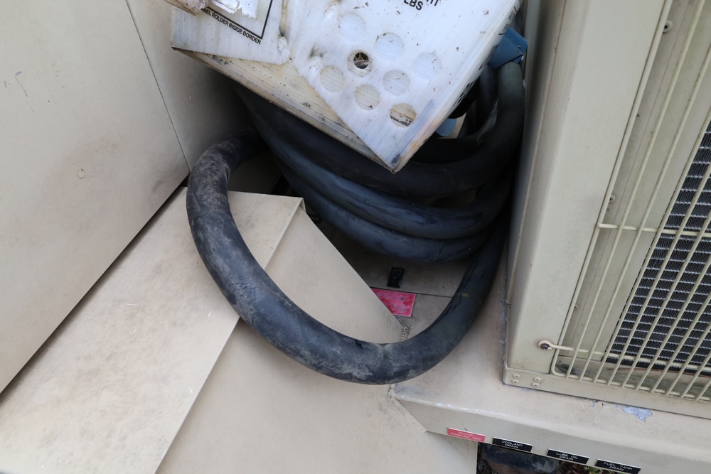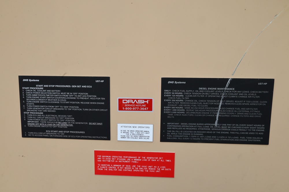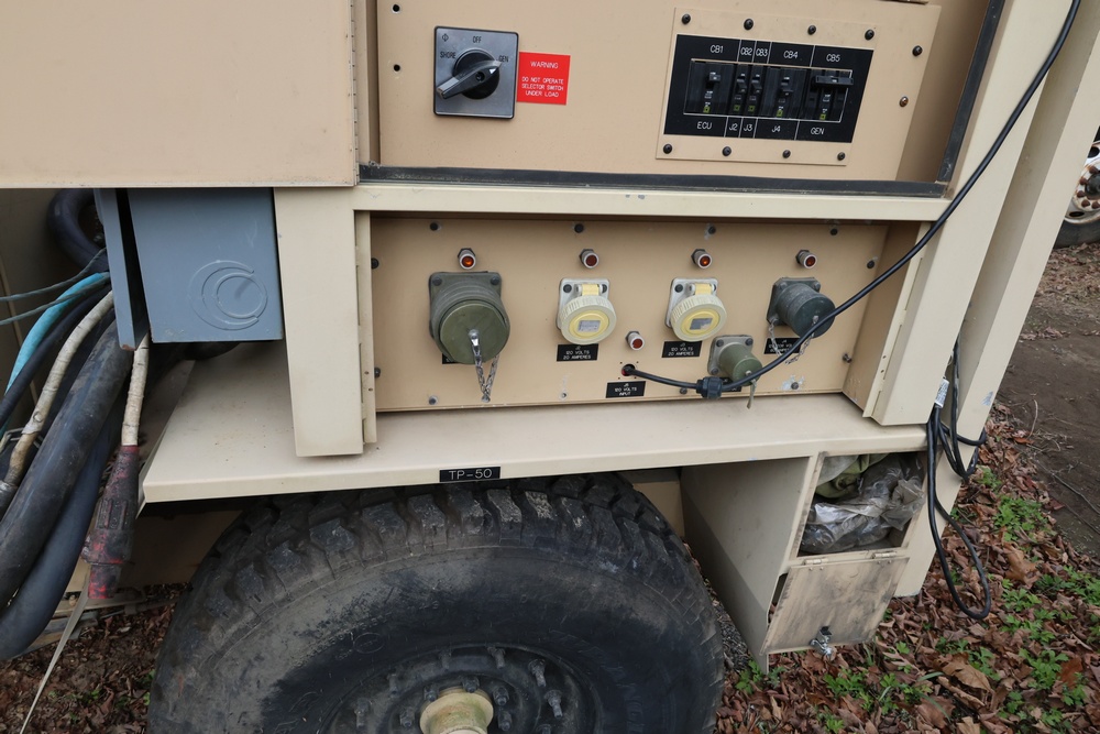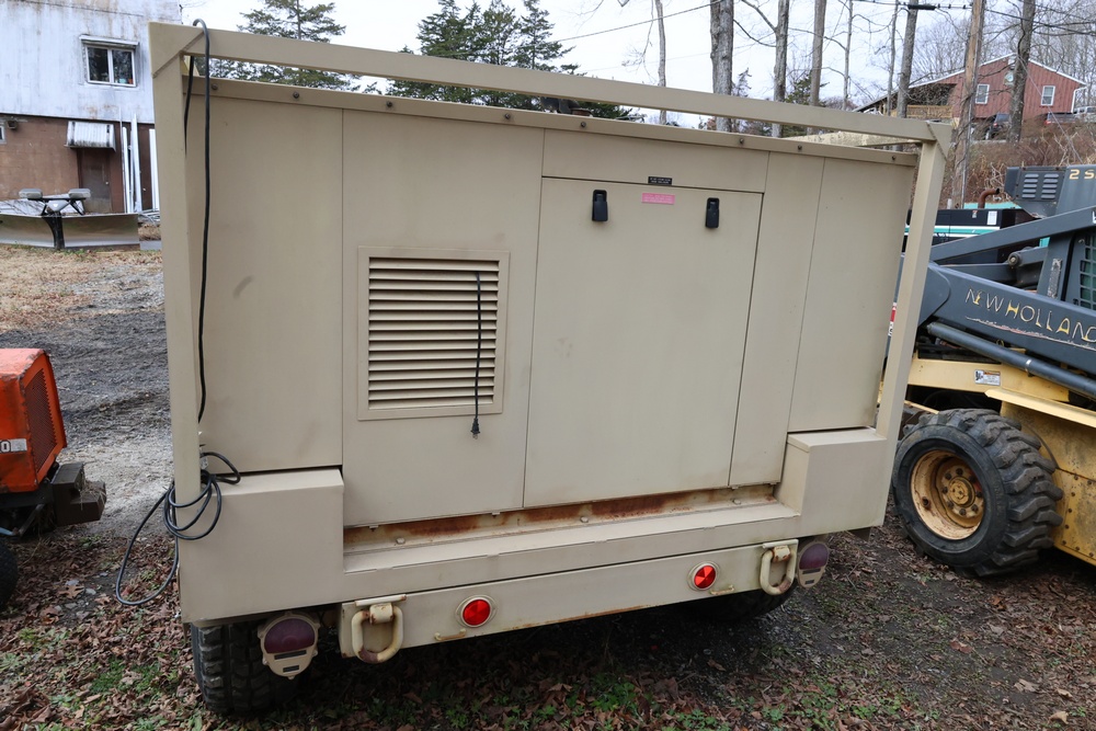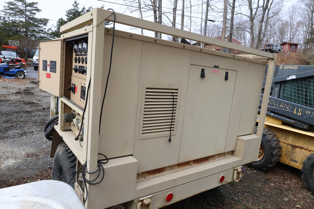 DHS Systems trailer-mounted environmental control unit with United CoolAir DHS-8HT air-conditioning system (96,000 BTU cooling / 45,900 BTU heating), and onboard 30 KW diesel generator, showing 127.4 hours. Seller reports: generator runs but motor on cooling fan does not (see photos).