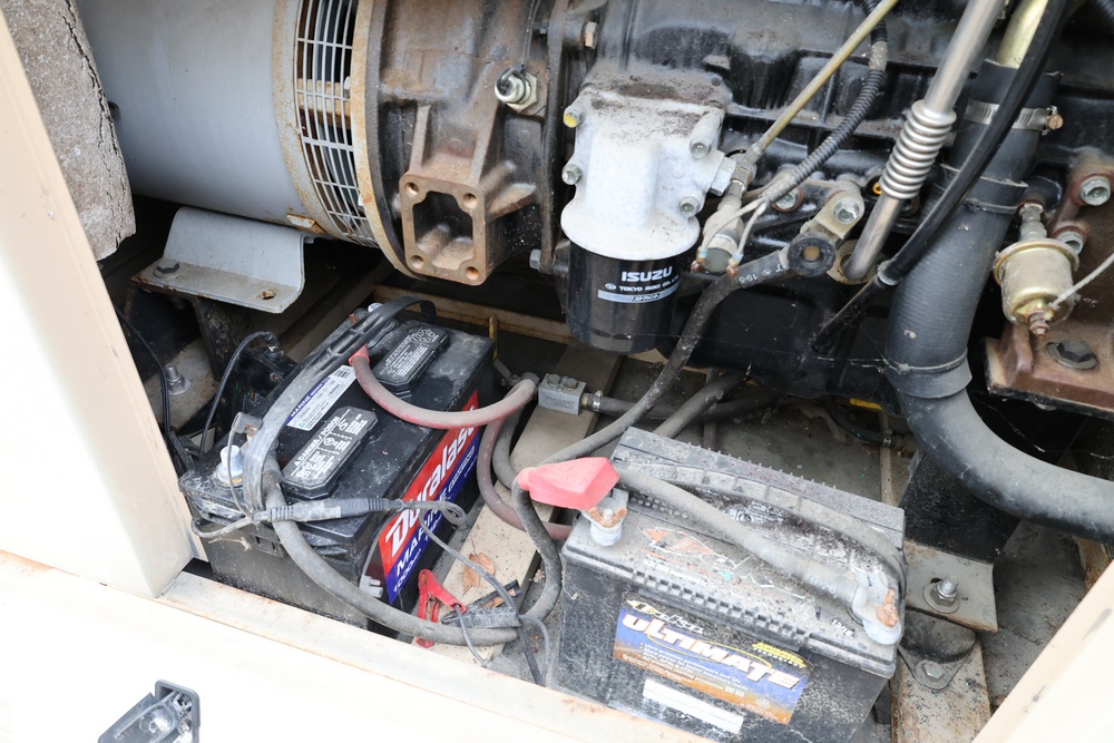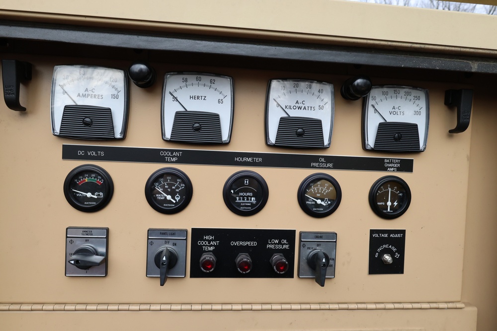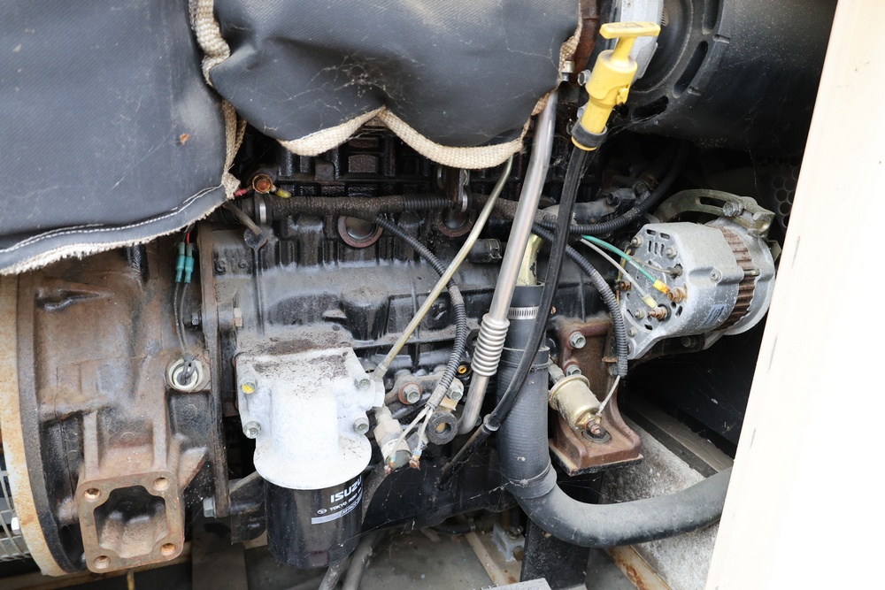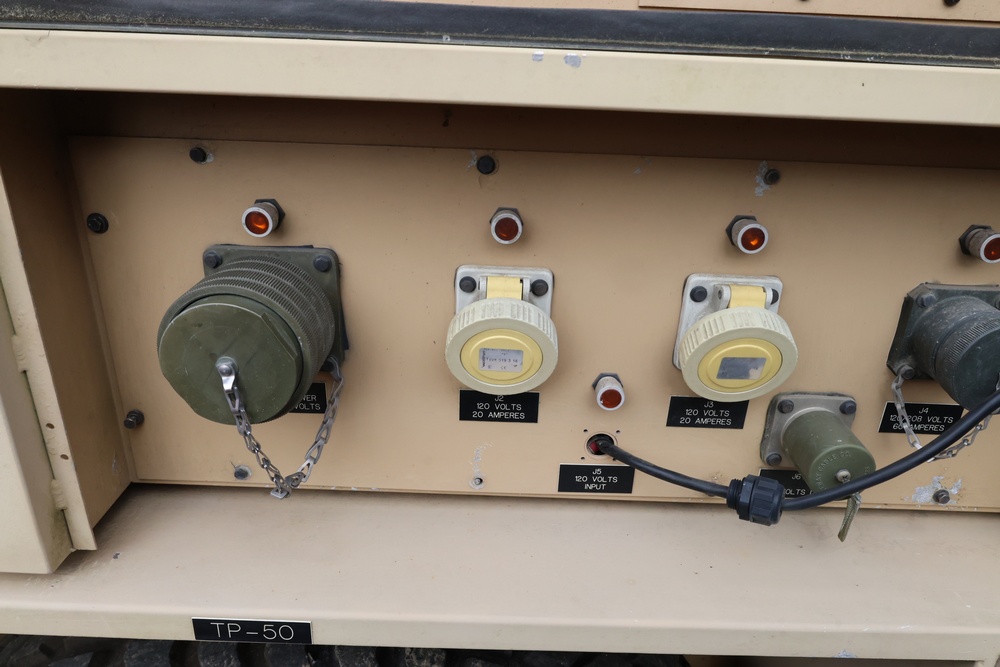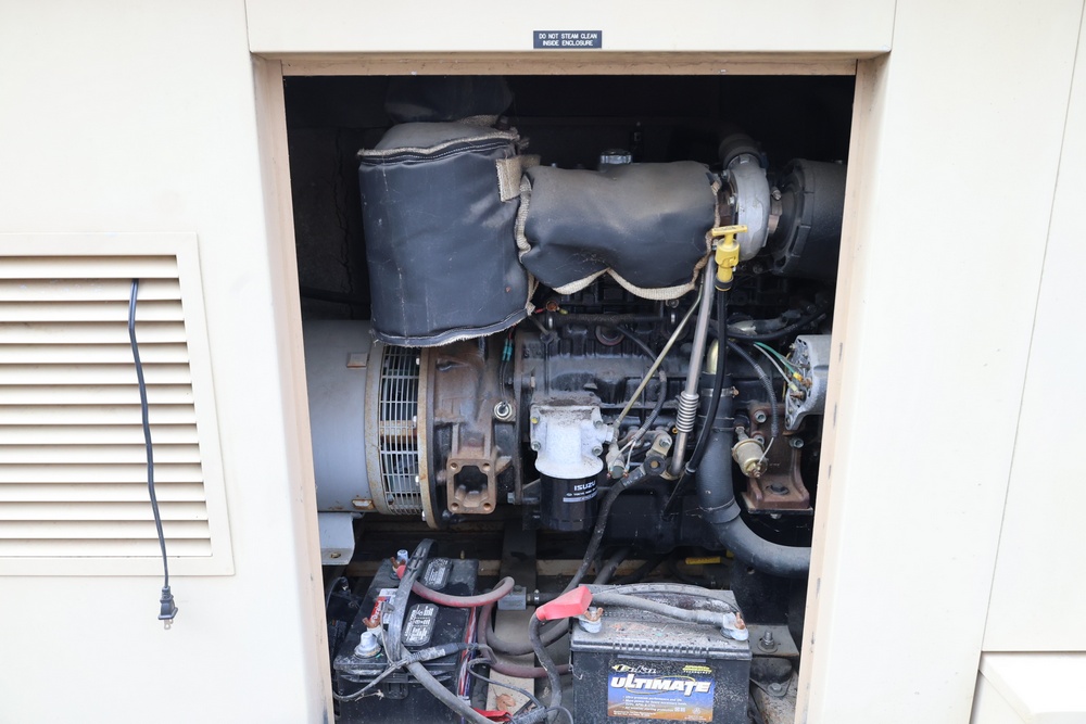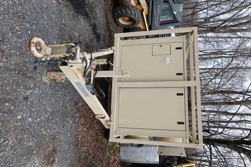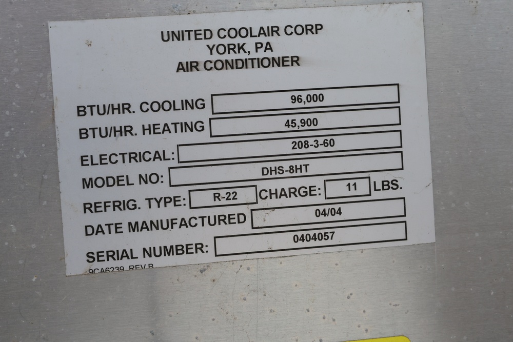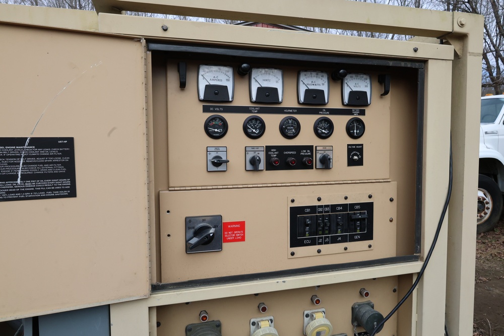 DHS Systems trailer-mounted environmental control unit with United CoolAir DHS-8HT air-conditioning system (96,000 BTU cooling / 45,900 BTU heating), and onboard 30 KW diesel generator, showing 127.4 hours. Seller reports: generator runs but motor on cooling fan does not (see photos).