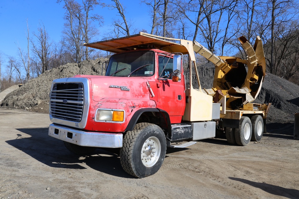 1992 Ford AeroMax L9000 truck-tractor with rear-mounted spade apparatus. VIN: 1FTYY95R8NVA25262. Body: Tandem-axle cab-and-chassis configured with a large hydraulically operated tree spade attachment. Odometer reading: 127101. Features visible include two-door cab, Clarion overhead radio, PTO controls, tandem rear axles, hydraulic lines and controls for the spade unit.