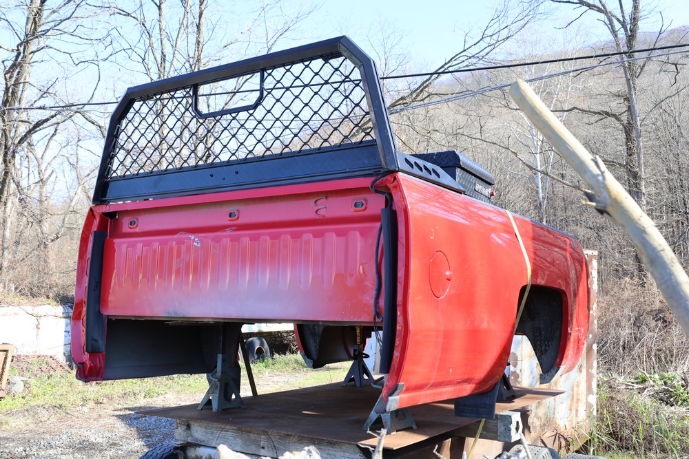 2023 or 2024 Chevrolet Silverado pickup bed assembly, removed from a 4×4 model. This lot includes the red short-bed box with tailgate, taillights, and a black DeeZee steel headache rack. The transfer tank shown in the photos is excluded.