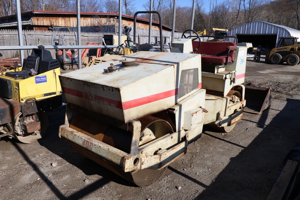 Rex SP400 vibratory double-drum roller. Model: SP 400 VIB ROLL. Serial No.: 4GL248. Hour meter shows 1302 total hours. Features include twin steel drums, articulating center joint, operator platform with bench seat and mechanical levers, hydraulic drive components, and an inline industrial engine