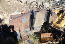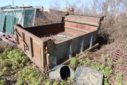 Galion steel dump body. Manufacturer tag shows “Galion” with capacity marking “5–6 YD” and additional stamped numbers partially legible (including body number 822702 and model marking “HG-88”). Includes sub frame.