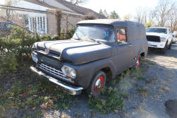 1959 Ford F-Series panel truck. VIN not visible. Body: 2-door panel van. Engine: Ford inline gasoline engine (displacement not marked). Transmission: floor-shift manual. Odometer reading: 93754. Features include dual front bucket seats, rear double cargo doors, steel wheels with hubcaps, and rear leaf-spring suspension. Seller reports: runs but is not road worthy, brakes do not work, bill of sale only.