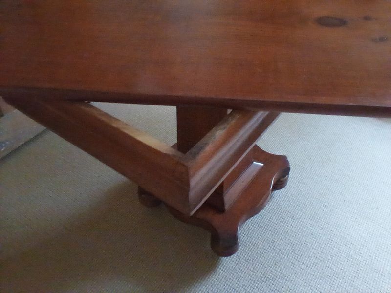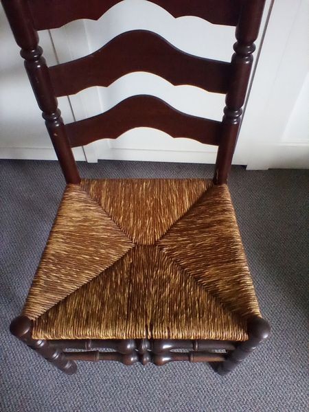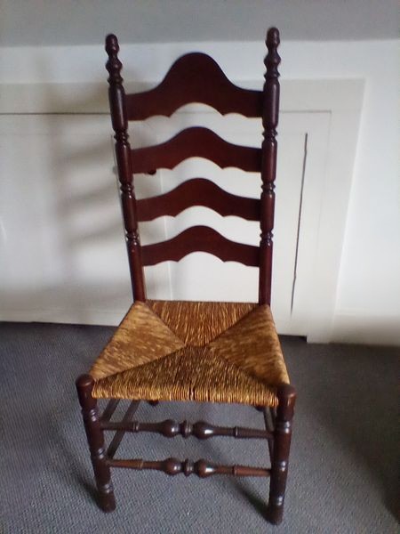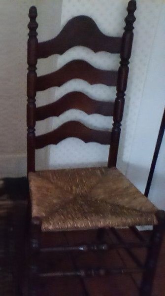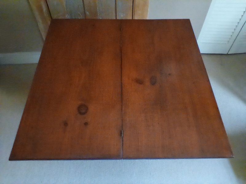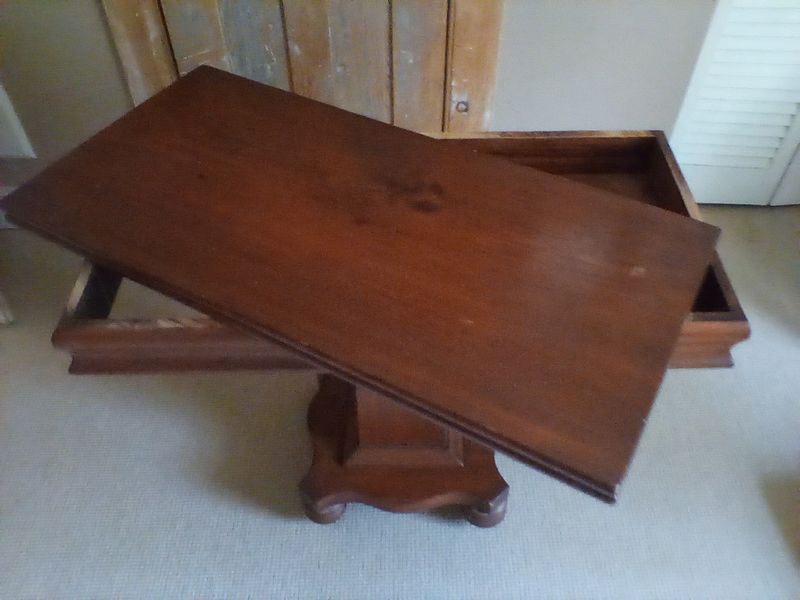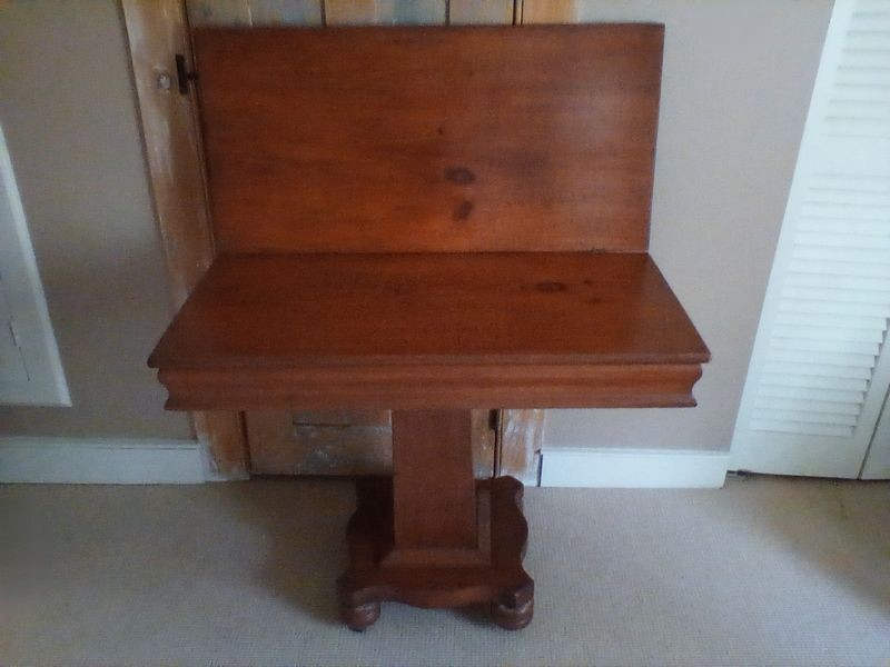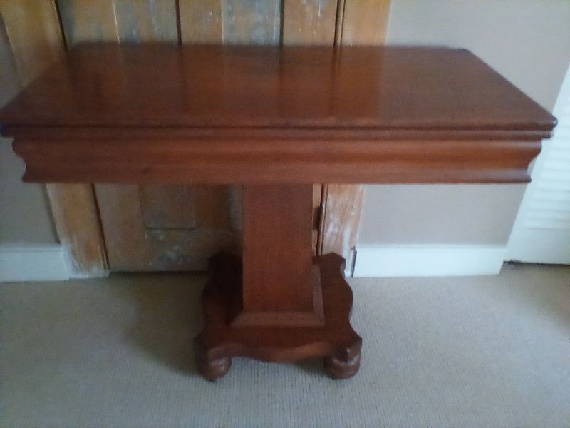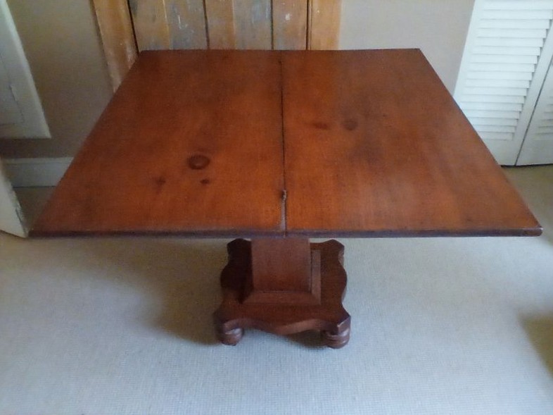 Vintage Entry Table, Chairs. Vintage wood flip top card table on pedestal base with wheels, 35.5"Wx17.5"Dx29"H, opens to 35"sq; pair of ladderback rugs seat chairs, ea. 20"Wx16"Dx46"H (matches chairs in lot #2). Table can be used multi ways (card table, entry table closed, entry table flip top upwards). Loc on 2nd fl.