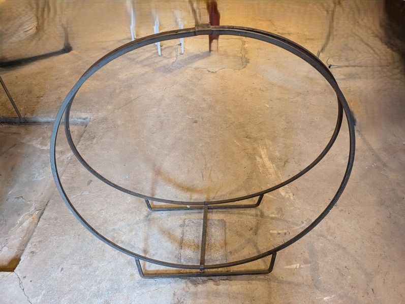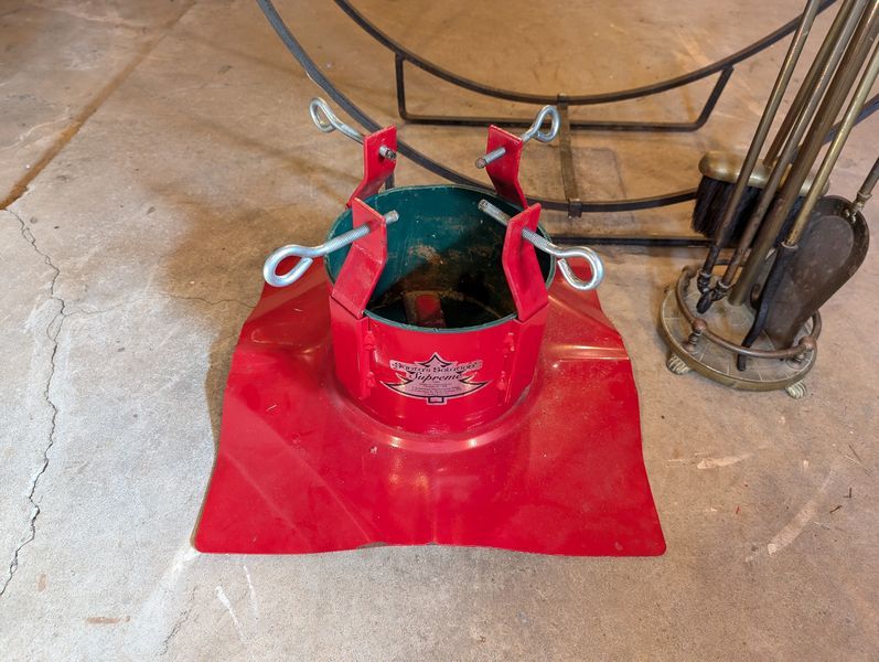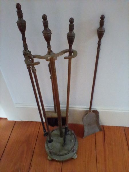 Fireplace Tools, Iron Tree Stand. Metal log holder, 38"diam; f/p tools in stand; iron tree stand, 18"sq. Loc in basement.