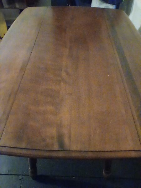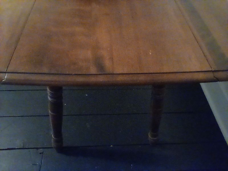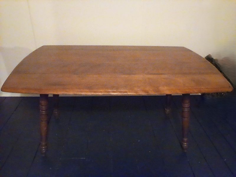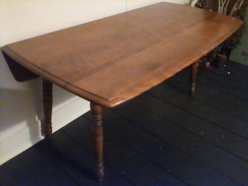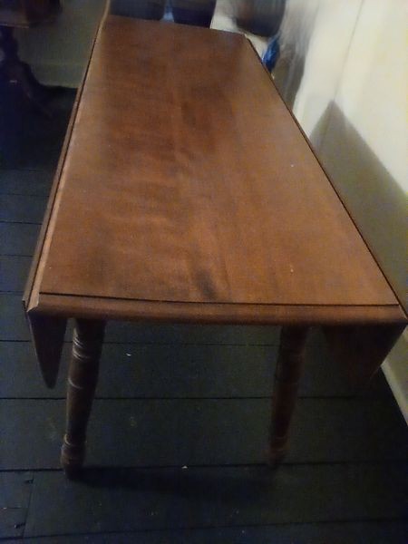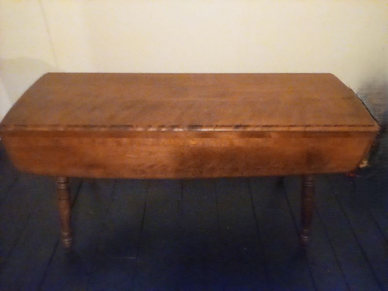 Dropleaf Table. Antique drop leaf table with beveled edge & turned legs, 6'Wx20"Dx29"H (closed), opens to 40"D. Loc in 3rd fl attic.
