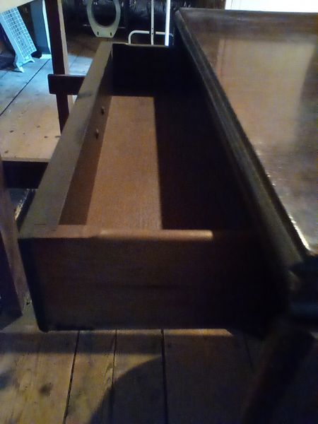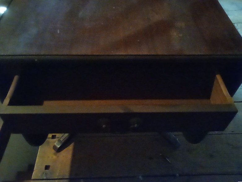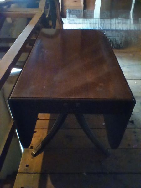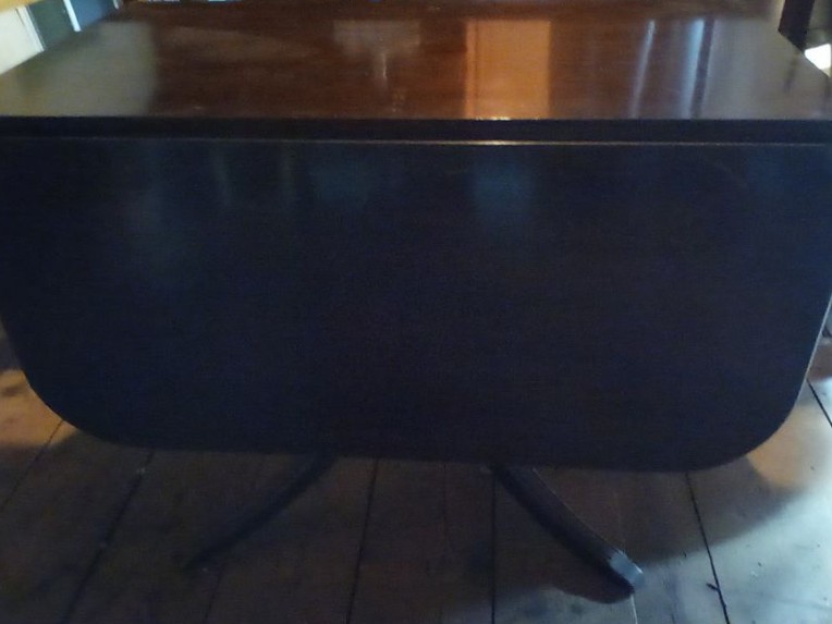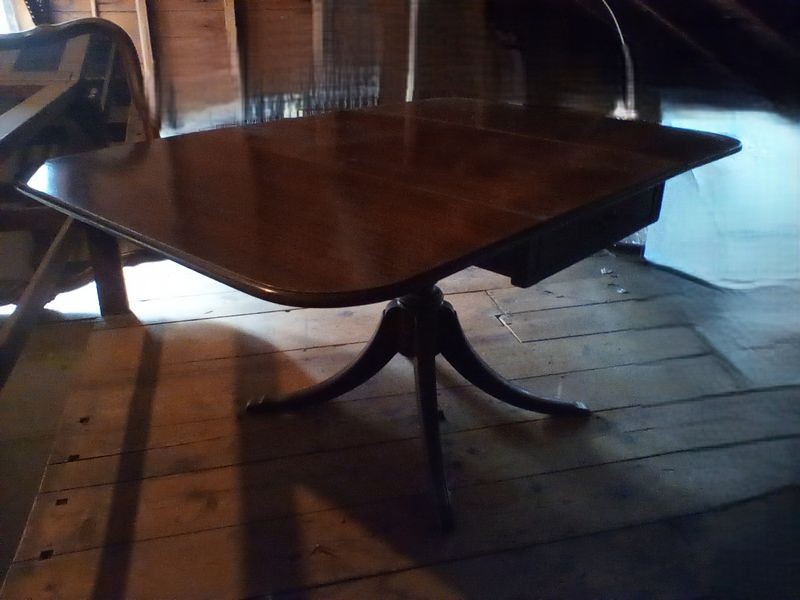 Pedestal Dropleaf Table. Antique mahogany dropleaf table with single dovetailed-drawer & custom pads, 5'Lx40"Dx29"H (open), 22"x40" (closed). Loc in 3rd Fl attic.
