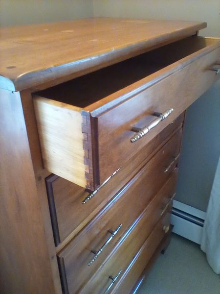 Antique Chest. Five dovetailed-drawer maple chest, 32"Wx18"Dx45"H (replaced hard ware & surface wear-see photos). Loc on 2nd fl.