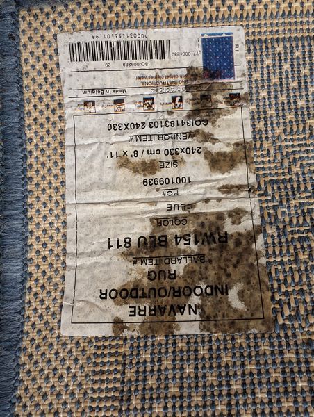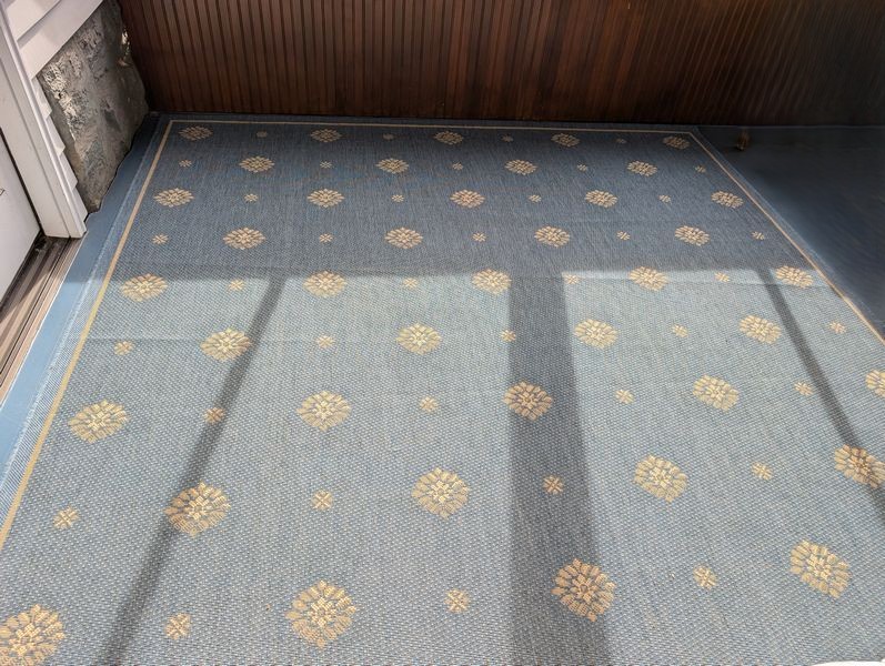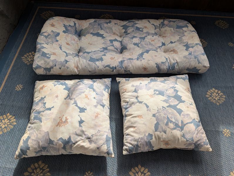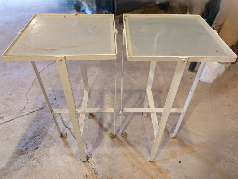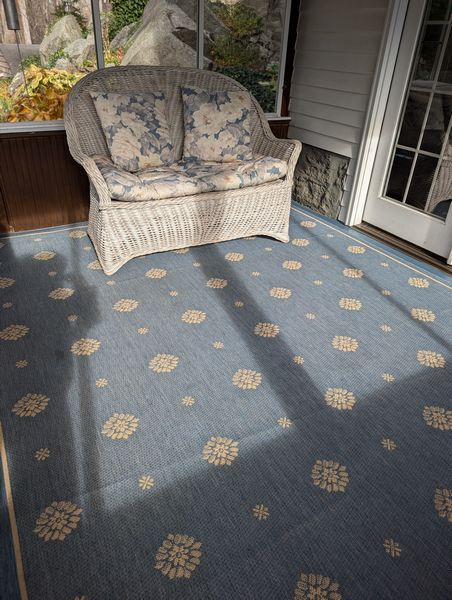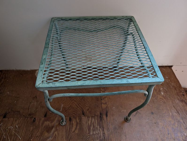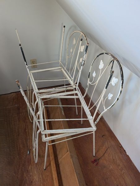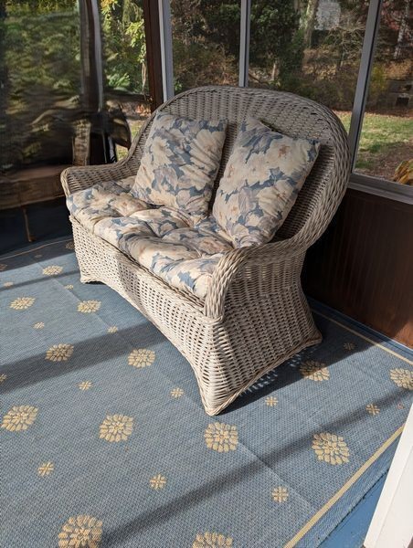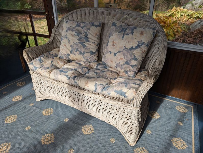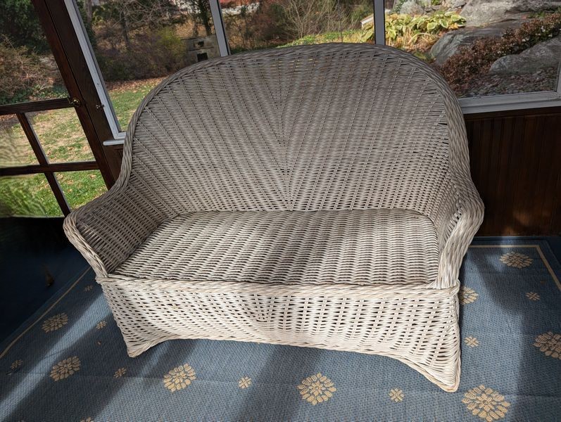 Antique Wicker Bench, Outdoor Rug, Wrought Iron Tables, Chairs. Porch furniture including two-seater wicker bench, 52"Wx29"Dx39"H; indoor/outdoor rug, approx. 8'x11'; pair of white iron side tables, ea. 1'sq; set of four iron chairs (no cushions); gr metal side table. See photos. Loc on encl porch and garage walk-up.