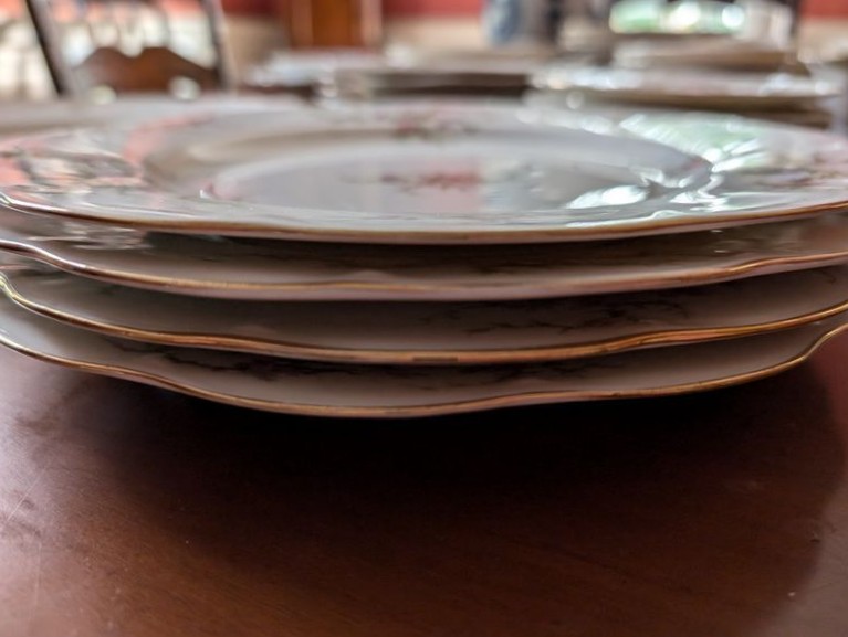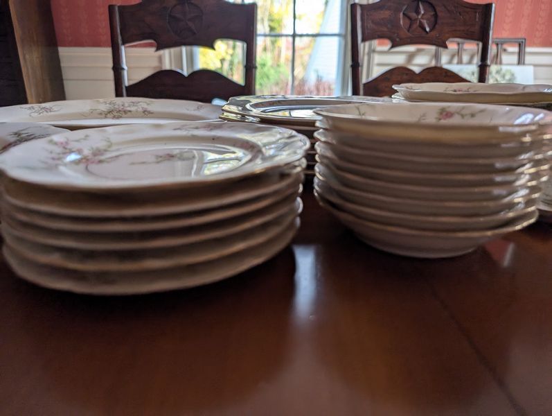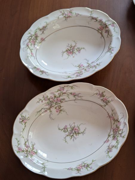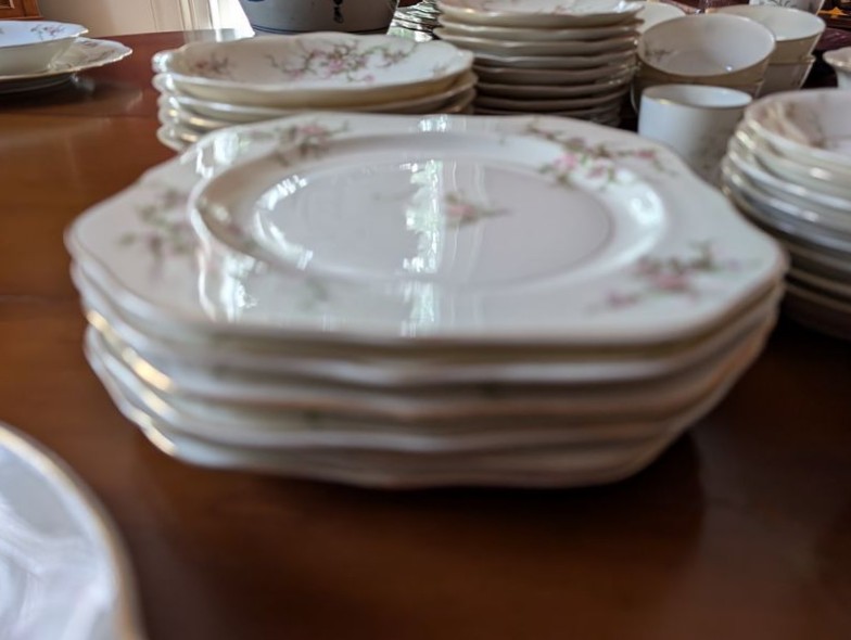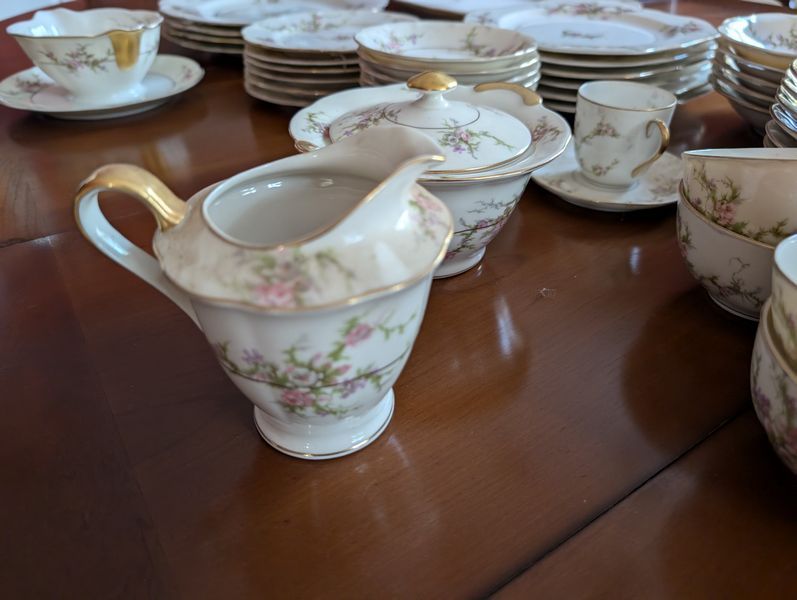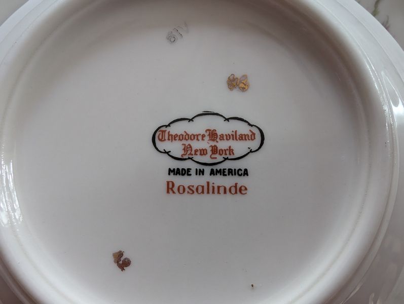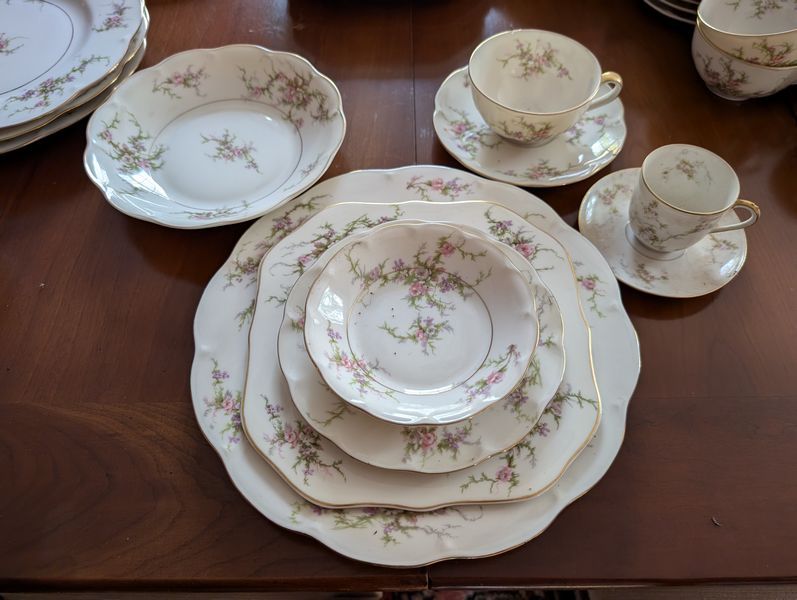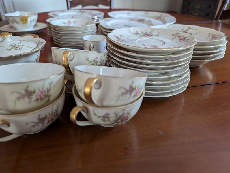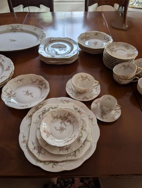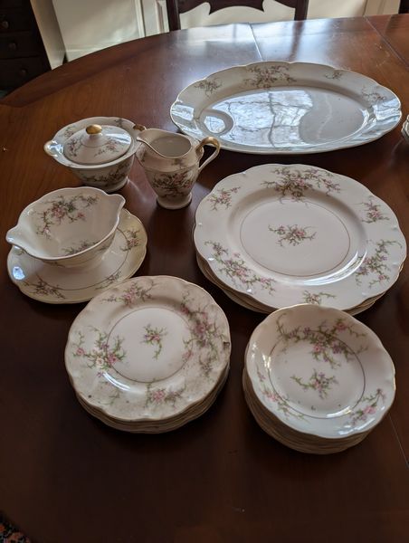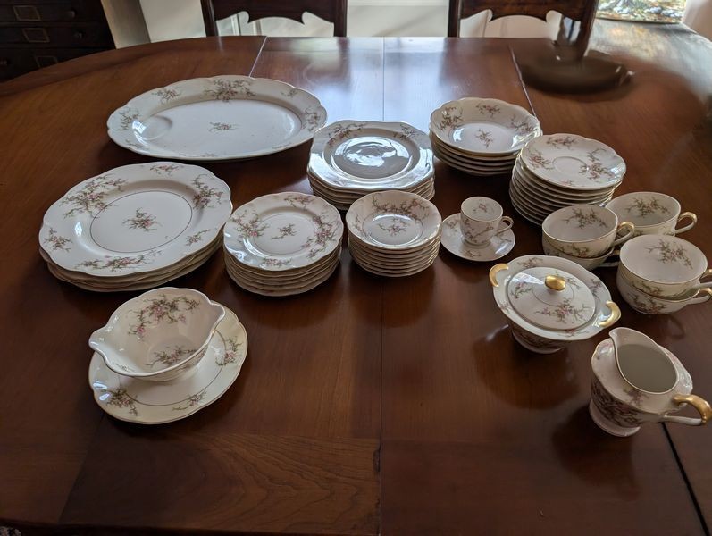 Haviland Dish Set. Theodore Haviland "Rosalinde" dish set (approx. 54 pieces, incomplete), incl: 16" meat dish; 10" dinner; 8"soup; salad; creamer (no sugar); gravy boat; two 9" ea. veg bowls; other items as seen in photos. Table not incl.