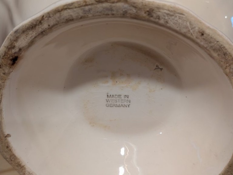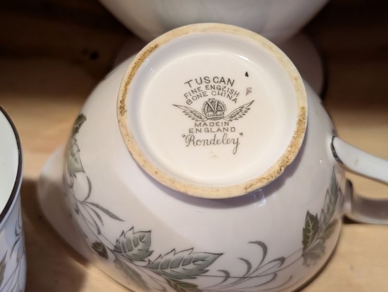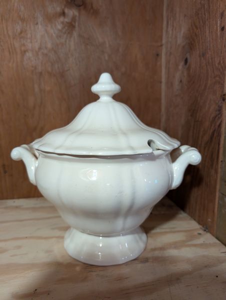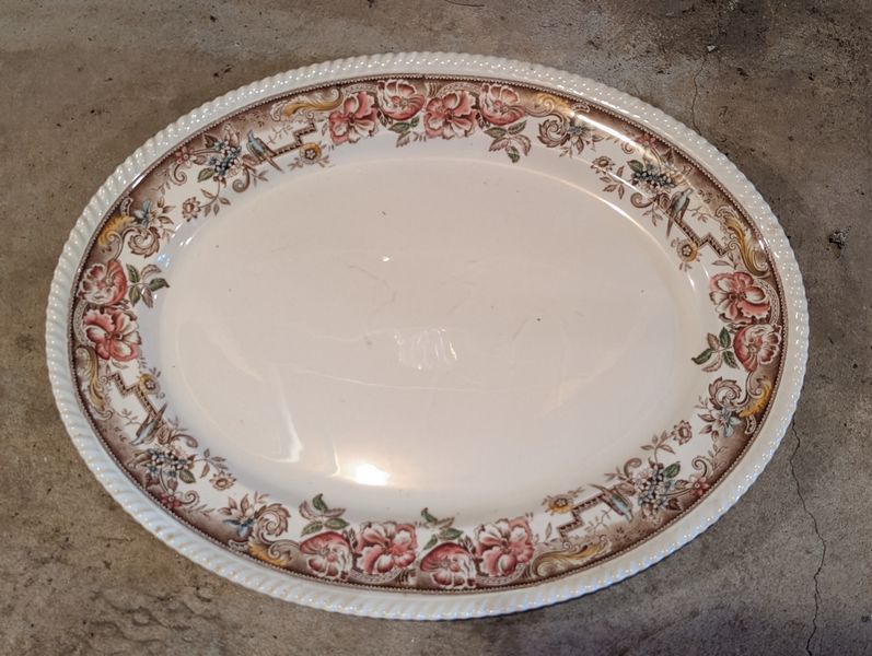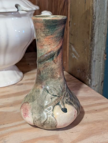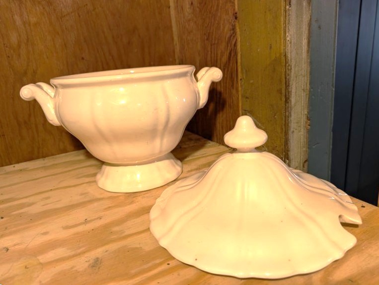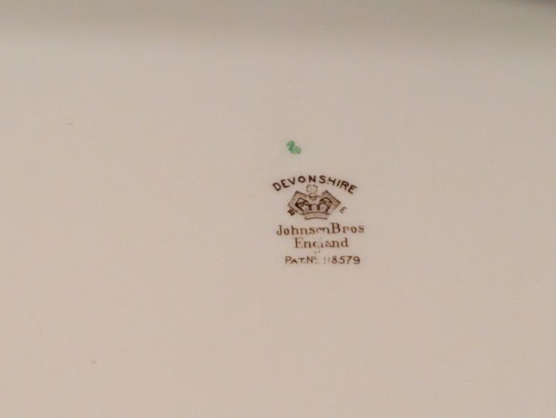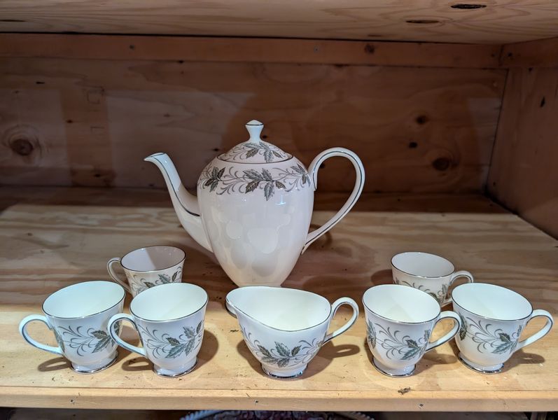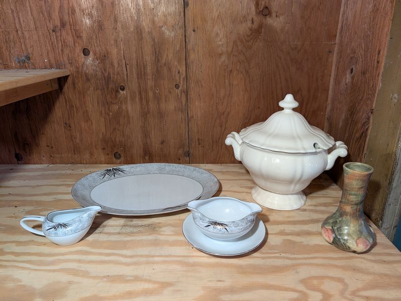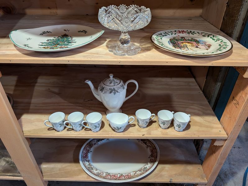 Quality Entertaining, featuring Weller, Lenox. Approx 18 pieces quality entertaining pieces including Weller vase, 7"H; Lenox holiday plate, 11"diam; Spode double-handled Christmas plate, 13"diam; Johnson Bros. platter, 18"L; nine-piece coffee server with covered pot, matching set of 6 cups & creamer; covered soup taurine, 11"diam (no ladle); other items as seen in photos. Loc in basement.
