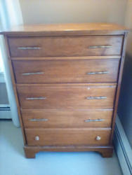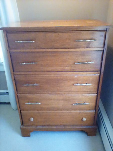 Antique Chest. Five dovetailed-drawer maple chest, 32"Wx18"Dx45"H (replaced hard ware & surface wear-see photos). Loc on 2nd fl.