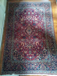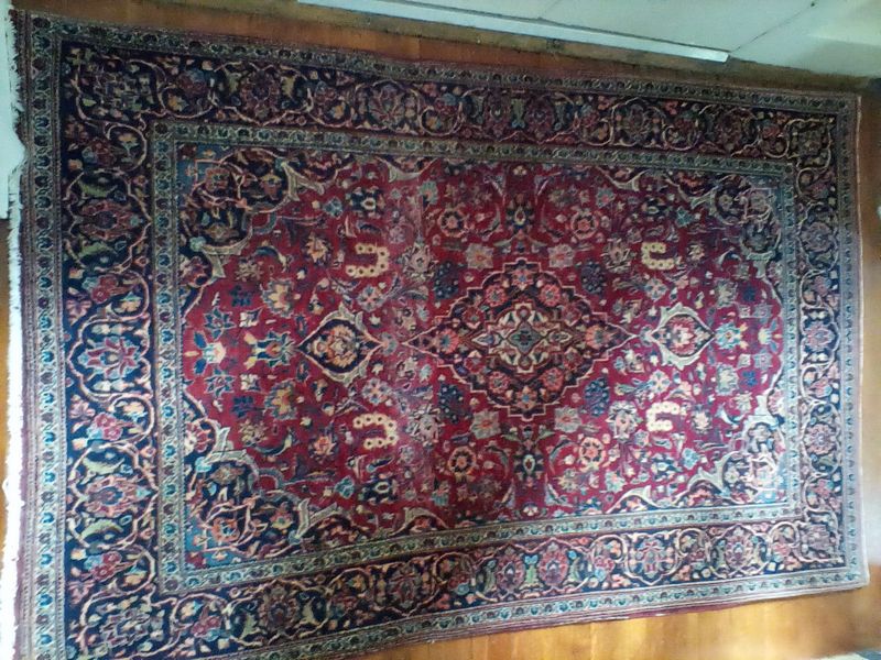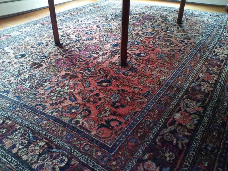 Antique Area Rug. Large dining or living room antique area rug, approx. 8.7'x13'. See photos for pattern. 1"x3" hole in rug-see photo. Furniture seen in photos not included. Loc on 1st fl in dining room.