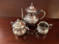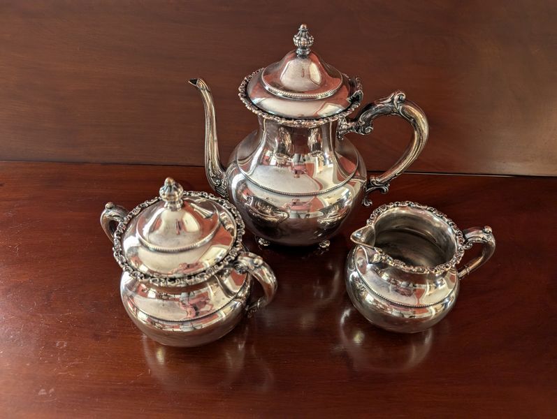 Plated Coffee Service Set. Vanbergh Co. US made quadruple plate coffee serving set including coffee pot, 8.5"Wx9"H; covered sugar, 6"Wx6"H; creamer, 5"Wx4"H.