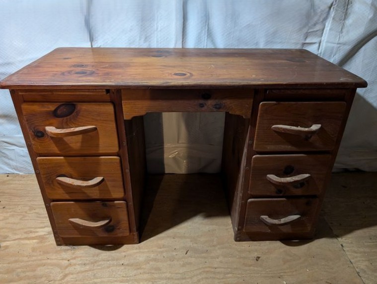 Vintage Desk, Arm Chair. Vintage wood seven-drawer work desk, 4'Wx22"Dx30"H; vinyl arm chair withnail head trim. See photos for details. Loc in Basement.