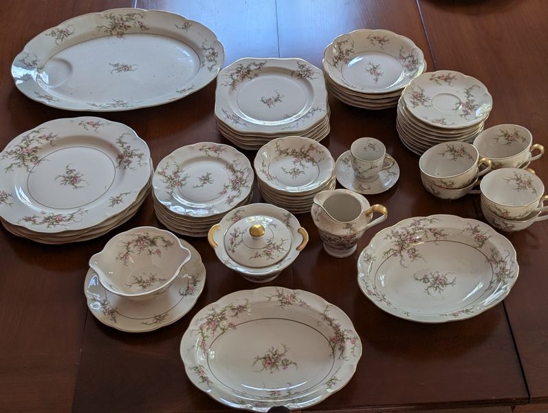 Haviland Dish Set. Theodore Haviland "Rosalinde" dish set (approx. 54 pieces, incomplete), incl: 16" meat dish; 10" dinner; 8"soup; salad; creamer (no sugar); gravy boat; two 9" ea. veg bowls; other items as seen in photos. Table not incl.