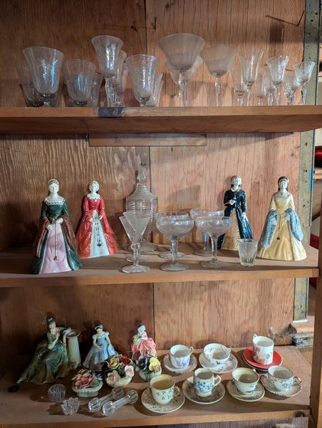Fine Porcelain and Crystal. Approximately 56 pieces incuding porcelain figurines (tallest, 9"H); demitasse cups & saucer sets; glass jar, 9"H; crystal knife rests; vintage glassware; more! See photos for more details. Loc in basement.