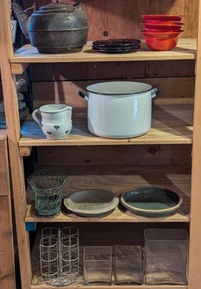 Vintage Kitchen Entertaining. Including white metal pot, 11"H; glass vases (tallest, 9"H); pie dish, 10"diam; iron tea kettle, 1'Wx8"H; set red dishes; other related items as seen in photos. Loc in basement.