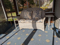 Antique Wicker Bench, Outdoor Rug, Wrought Iron Tables, Chairs. Porch furniture including two-seater wicker bench, 52"Wx29"Dx39"H; indoor/outdoor rug, approx. 8'x11'; pair of white iron side tables, ea. 1'sq; set of four iron chairs (no cushions); gr metal side table. See photos. Loc on encl porch and garage walk-up.
