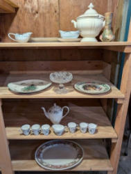 Quality Entertaining, featuring Weller, Lenox. Approx 18 pieces quality entertaining pieces including Weller vase, 7"H; Lenox holiday plate, 11"diam; Spode double-handled Christmas plate, 13"diam; Johnson Bros. platter, 18"L; nine-piece coffee server with covered pot, matching set of 6 cups & creamer; covered soup taurine, 11"diam (no ladle); other items as seen in photos. Loc in basement.
