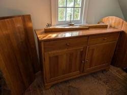 Dining Set including matching table, 43"diam with two 18" ea. table inserts (brings table to oval), set of six chairs (two arm, four side, ea. approx. 2'Wx17Dx37"H; matching sideboard buffet, 54"Wx18"Dx34"H. Loc in garage walk up. Table had been dismantled for easy transport.