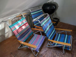 Grill, Outdoor Seating. Weber charcoal grill; four folding lawn chairs (at least one by Telescope). Loc in garage walk up.
