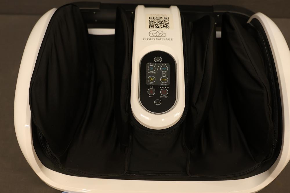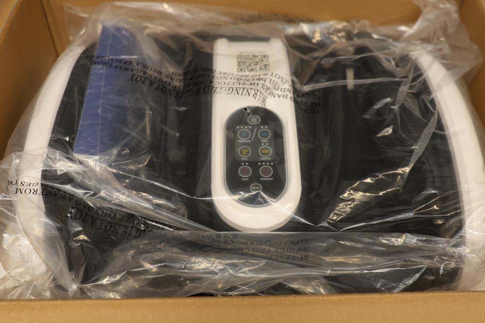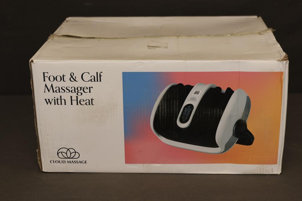 Cloud Massage Foot and Calf Massager with Heat. Includes massager unit, power adapter, and manual. Features adjustable intensity levels, heat therapy, and ergonomic design for foot and calf massage. Original box included with some wear. Pickup only.