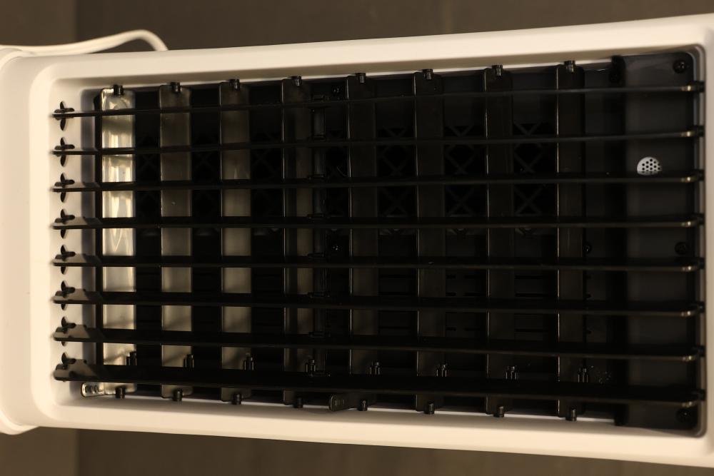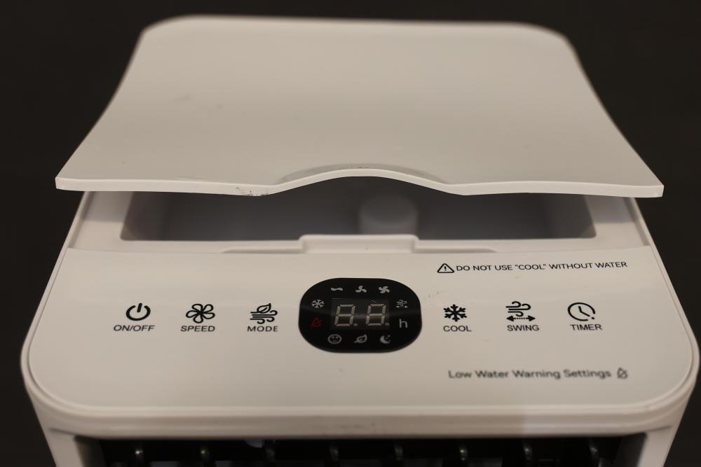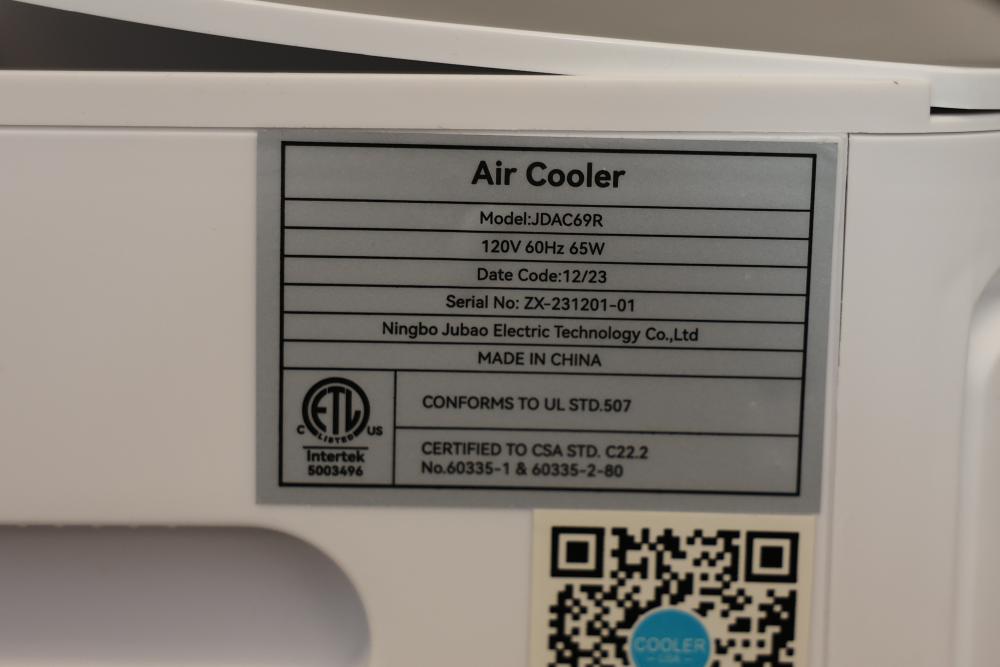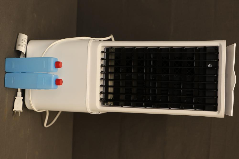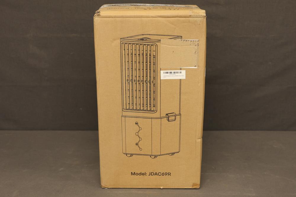 Cooltech Air Cooler Model JDAC69R, designed for cooling efficiency. Features include built-in control panel with options for speed, mode, cooling, swing, and timer settings. Includes two ice packs, a remote control, and an easy-to-fill water compartment. Powered by a 120V outlet. Pickup only.