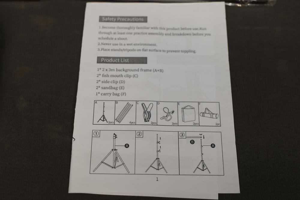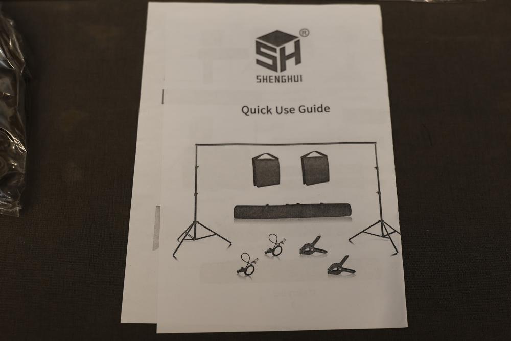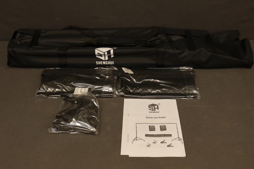 Shenghui Backdrop Stand with Accessories and Carrying Bag. Includes adjustable stand components, crossbars, clamps, and carrying bag. Some assembly required. Comes with an instruction guide for setup and use. Ideal for use in photography or videography projects. Pickup only.