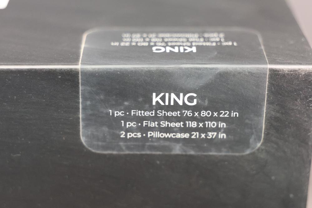 Protect-A-Bed King Size Charcoal Infused Sheet Set. Includes 1 fitted sheet (76 x 80 x 22 in), 1 flat sheet (118 x 110 in), and 2 pillowcases (21 x 37 in). Features soft-touch fabric, charcoal infusion for odor control, temperature regulation, and is OEKO-TEX Standard 100 certified. Water-resistant and machine washable. Pickup only.