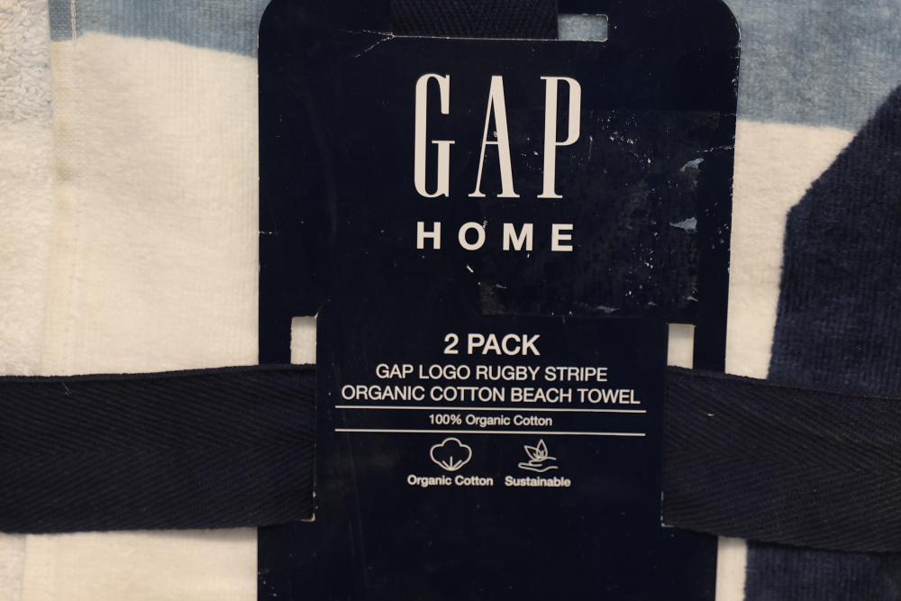 Gap Home Organic Cotton Beach Towel with Gap Logo and Rugby Stripe Pattern, 2 Pack. Made from 100 percent organic cotton, these towels feature a durable and sustainable design. They showcase a rugby stripe pattern and prominently display the Gap logo. Pickup only.