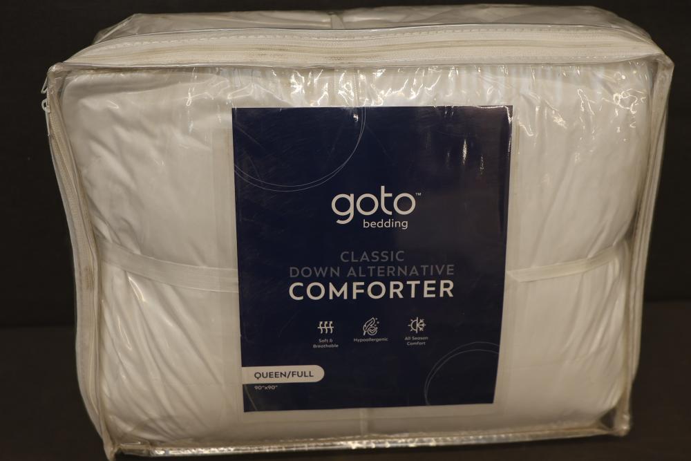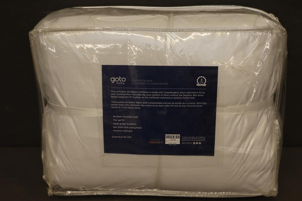 Goto Bedding Classic Down Alternative Comforter Queen-Full Size in White. A soft, comfortable down alternative comforter designed for durability and easy care. Queen-Full size and white in color. Brand new in original packaging with clear labeling of product details. Pickup only.
