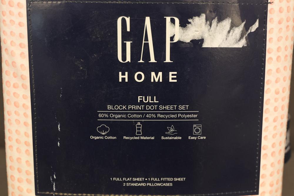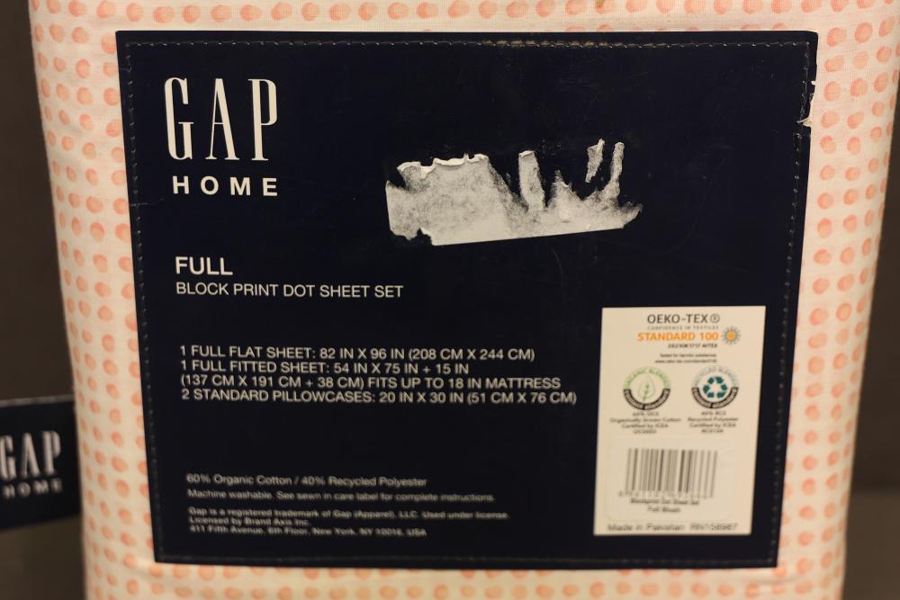 Gap Home Full Size Sheet Set in Block Print Dot Pattern. Includes one full flat sheet (82 in x 96 in), one full fitted sheet (54 in x 75 in x 15 in mattress), and two standard pillowcases (20 in x 30 in). Made from a blend of 60 percent organic cotton and 40 percent recycled polyester. Features sustainable material and easy care design. Pickup only.