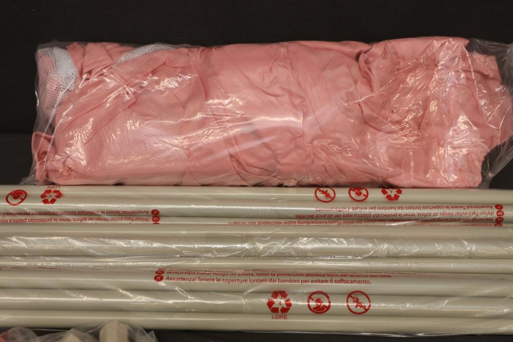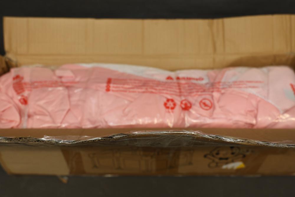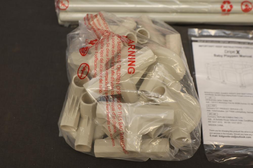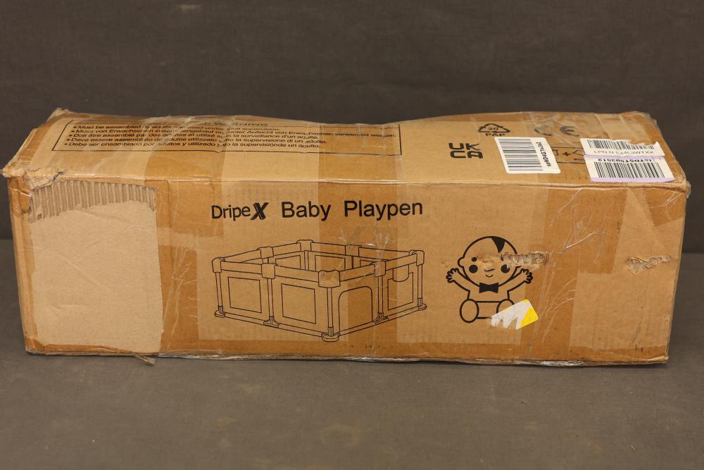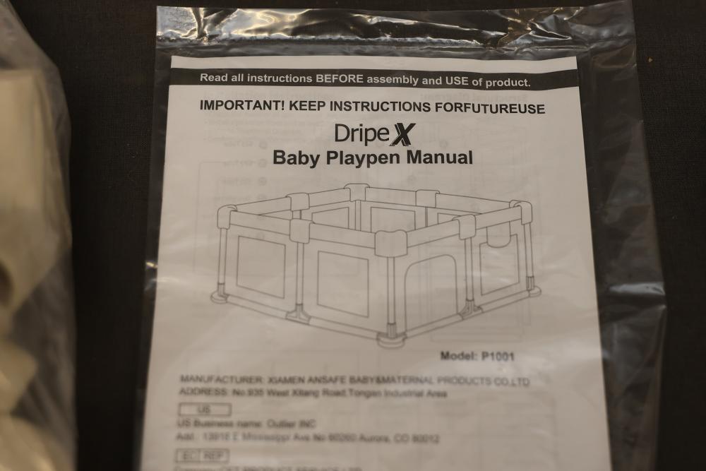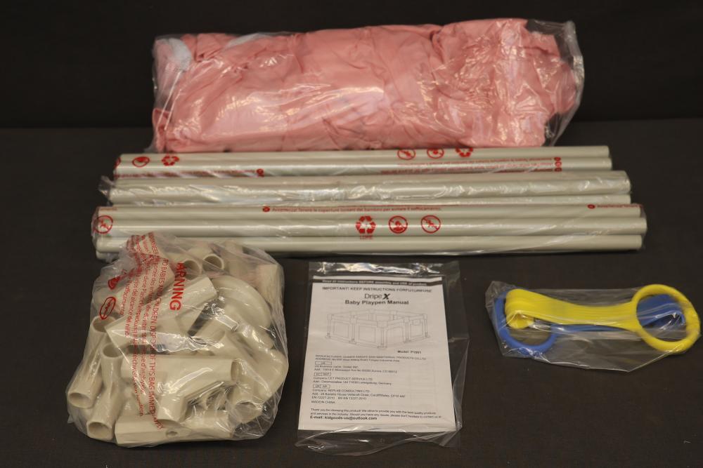 Dripex Pink Baby Playpen Model P1001 includes components such as pink fabric, connectors, plastic tubes, and an instruction manual. Suitable for home use and designed for child safety. Box may show wear. Pickup only.