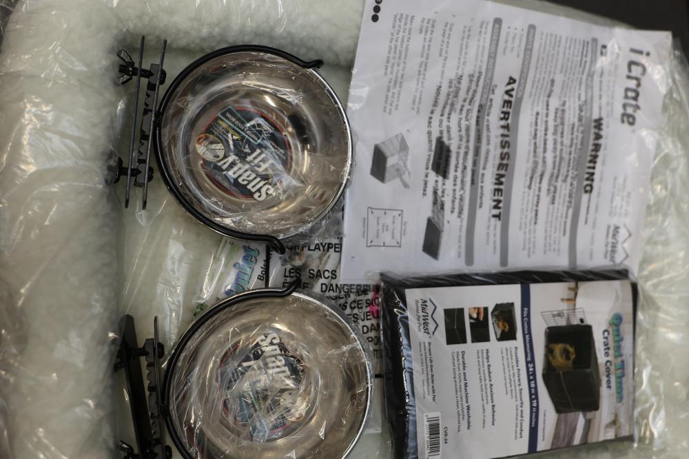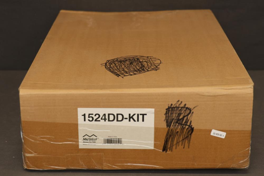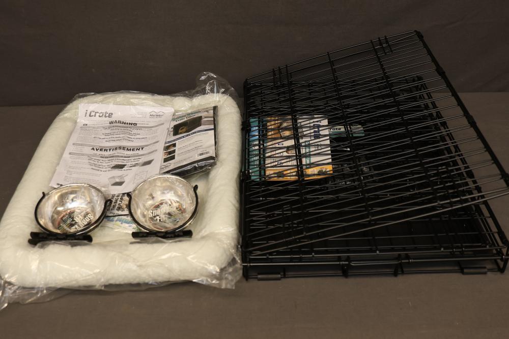 MidWest Homes For Pets iCrate Pet Crate Petite Size, Model 1524DD. Includes a petite-sized folding metal crate, removable pan, two stainless steel bowls with brackets, a fleece pet bed, and a crate cover. Designed for convenience and comfort with double doors for accessibility. Pickup only.