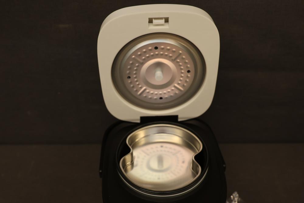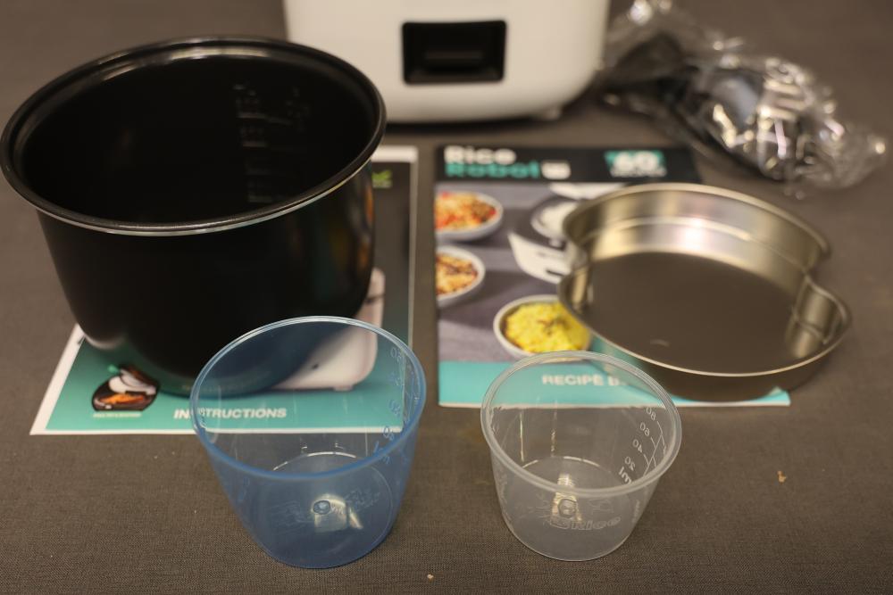Rice Robot Model WD-2524. Compact rice cooker with warm and cook settings. Includes inner cooking pot, measuring cups, recipe book, and instruction manual. Features a five-year limited warranty and ceramic inner coating. Household use only and certified for safety standards. Pickup only.