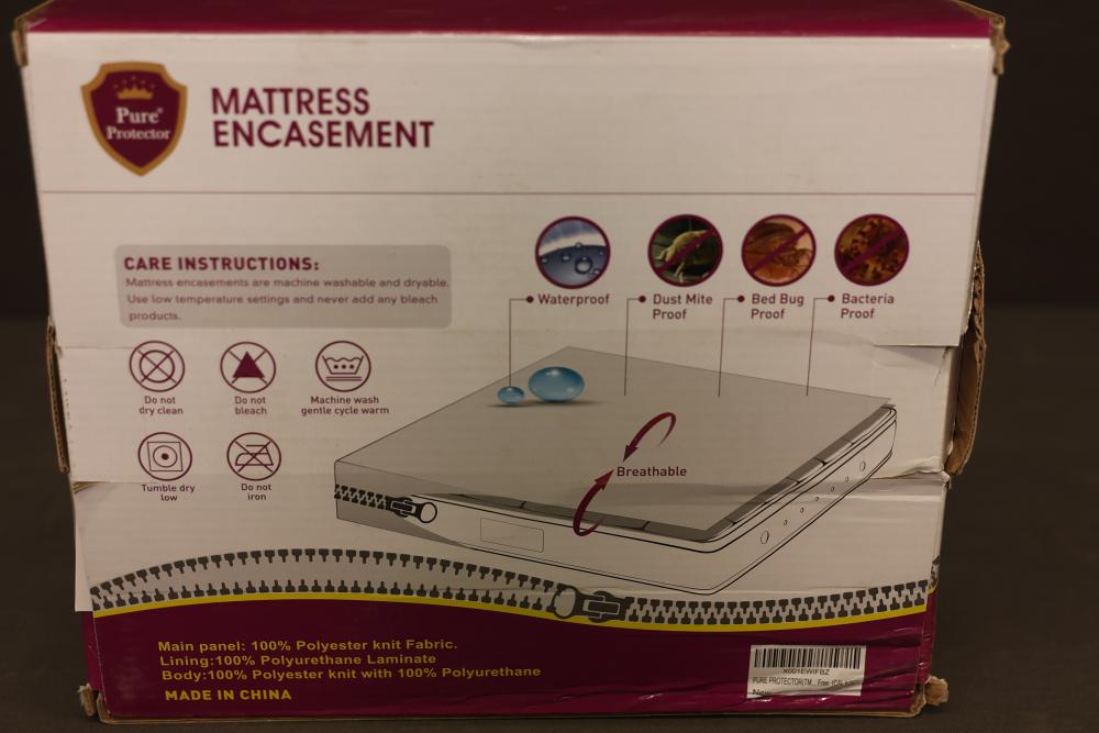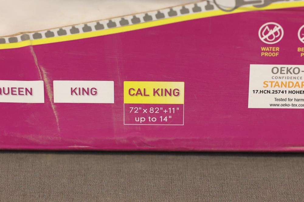 Pure Protector Waterproof Mattress Encasement Cal King Size in White. Designed to fit mattresses measuring 72 in. x 82 in. x 11 in. and up to 14 in. thick. Features include waterproof protection, zipper closure, and antimicrobial properties. Care instructions and material details are included on packaging. Pickup only.