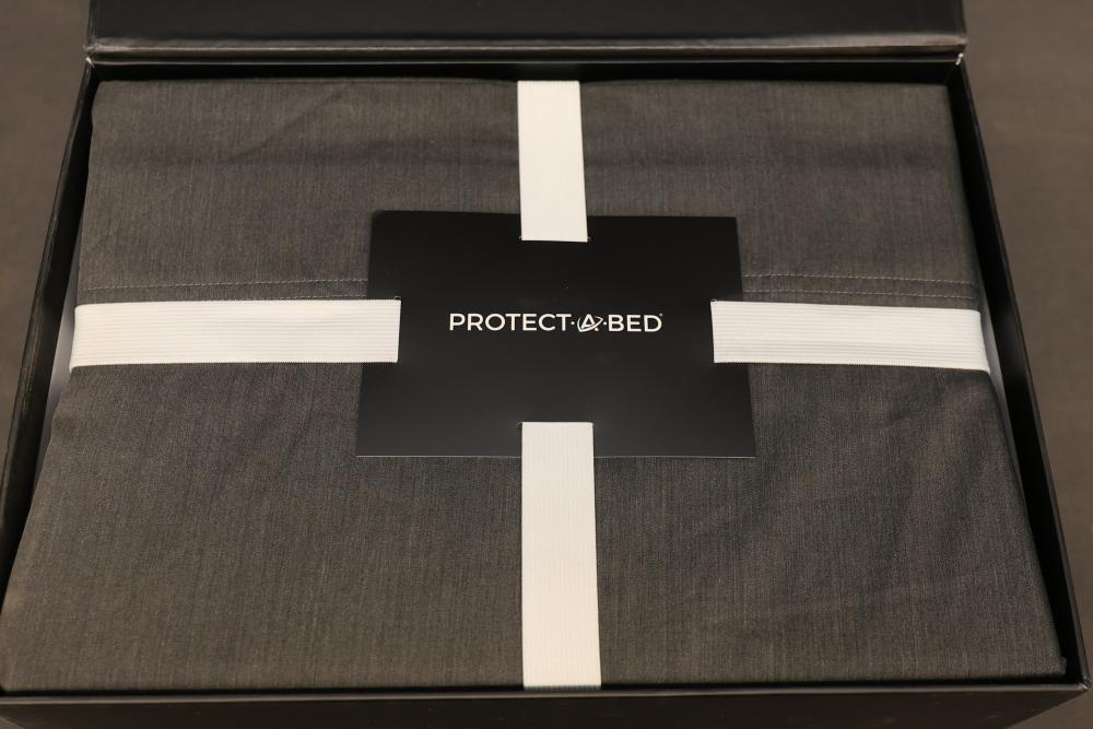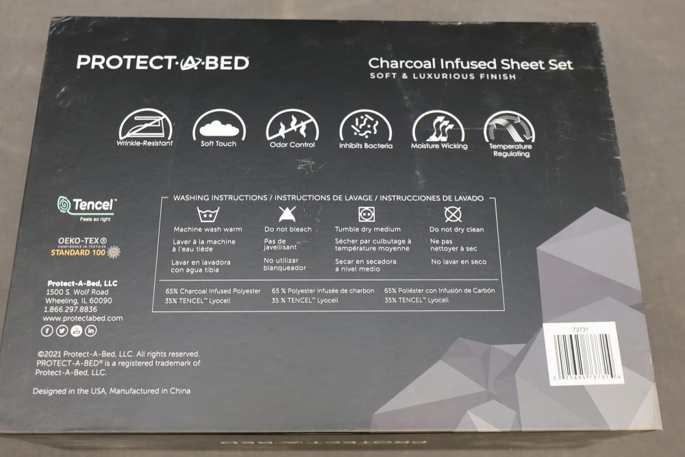 Protect-A-Bed King Size Charcoal Infused Sheet Set in Gray. Includes 1 fitted sheet measuring 76 by 80 by 22 inches, 1 flat sheet measuring 118 by 110 inches, and 2 pillowcases measuring 21 by 37 inches. Features a latex-free design with charcoal infusion, soft touch, odor control, and moisture-wicking properties. OEKO-TEX certified for safety. Pickup only.